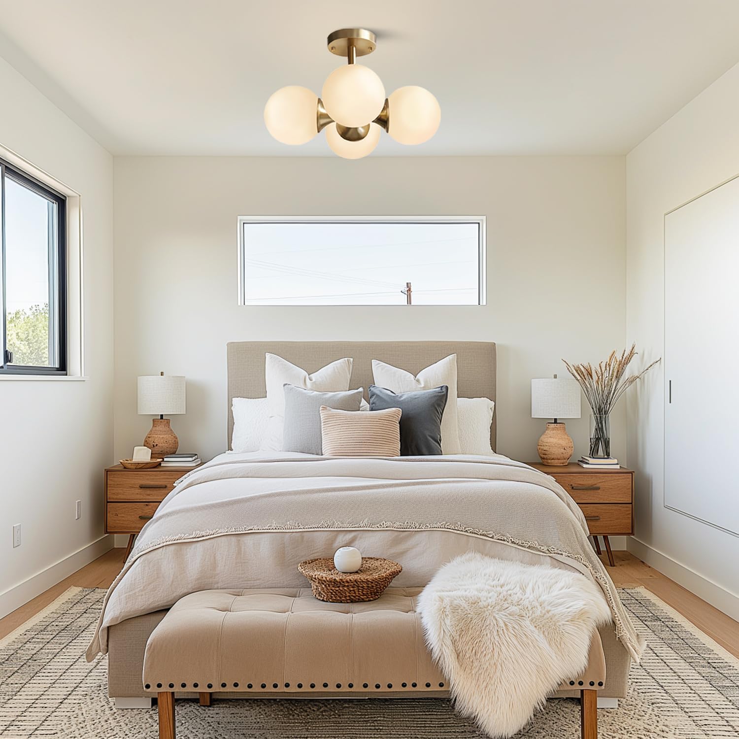 KCO Lighting Antique Brass 4-Light Ceiling Light Mid-Century Frosted Glass Globe Chandelier Modern Flush Mount Ceiling Light Fixtures for Bedroom Living Room