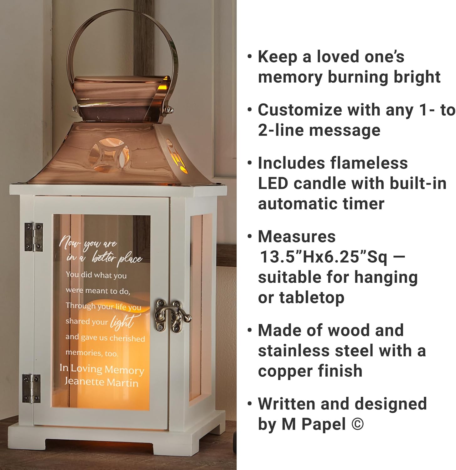 Let's Make Memories Personalized Memorial Lantern - Sympathy - Condolences - LED Candle - Automatic Timer - Wood/Stainless Steel - Copper Finish - in a Better Place
