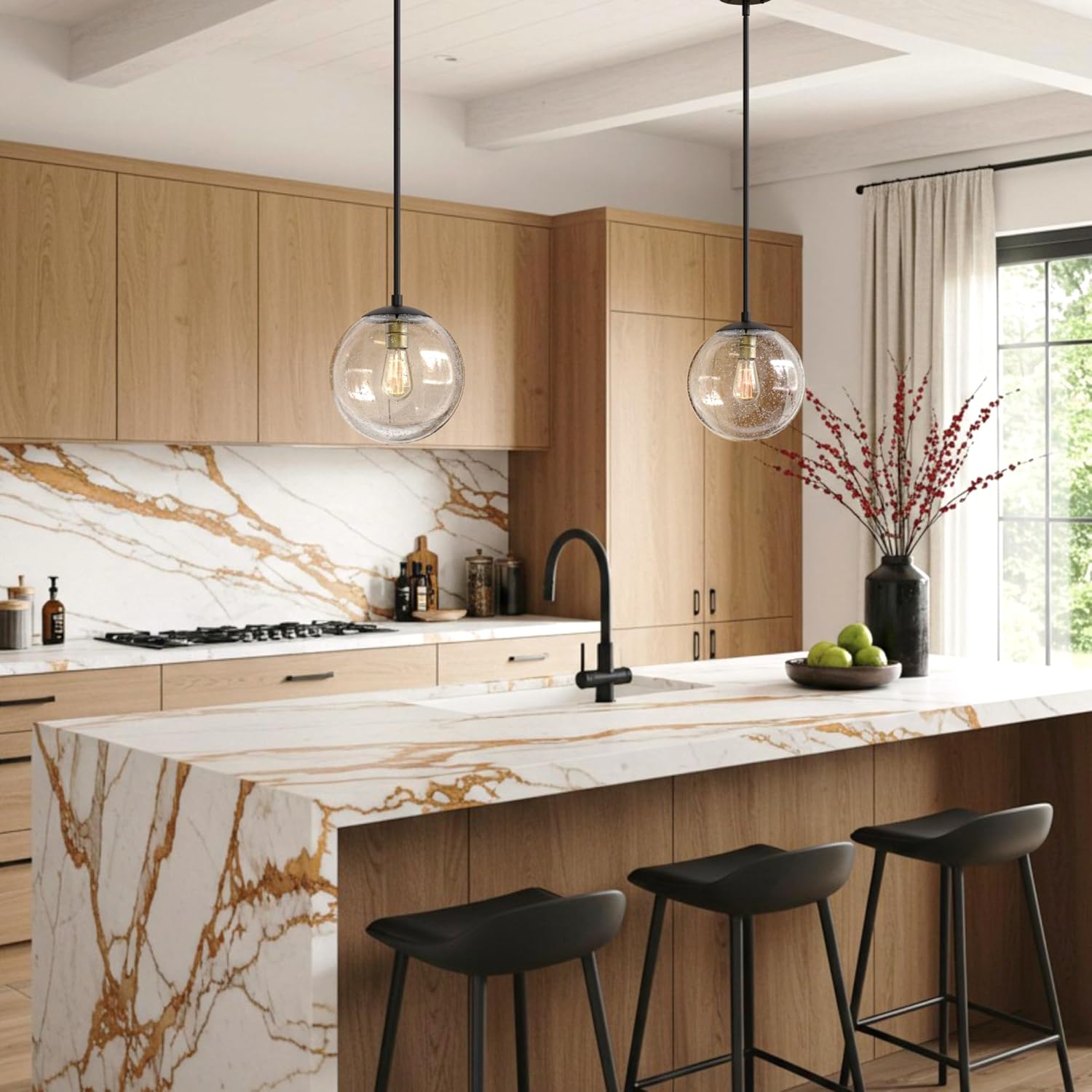 Globe Pendant Lighting, Black and Gold Pendant Light for Kitchen Island, 9.5 inch Seeded Globe Glass Shade for Kitchen, Hallway, Entryway, Dining Room, Bedroom, Living Room