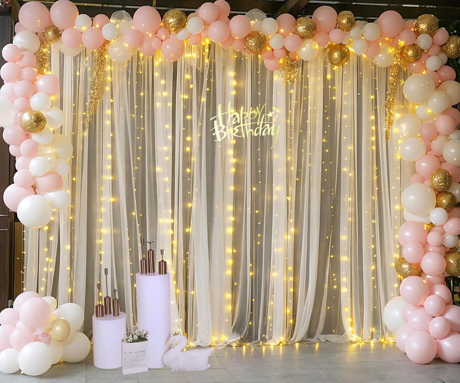 - Products include: 10ft×10ft champagne sheer tulle backdrop curtain, a set of 9.8ft warm white string light and 12pcs Transparent clips (no remote control).
