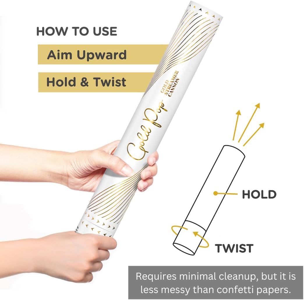 - š EASY POINT & TWIST ACTION - Don't need the strongest arms to blow up these babies! Point upwards away from people and twist to shoot, GOLD Streamer is loaded on top of compressed air and is launched by twisting the cannon. Operation manual is included inside the box.