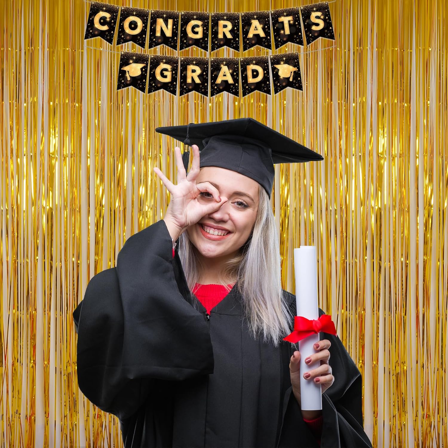 - Value Pack of 2: Includes 2 packs gold foil fringe curtains, enough to decorate your party backdrop and save your money. Each curtain is 3.2ft x 8ft. You can use 2 packs of the curtains side by side to make the backdrop larger, or overlap 2 pack of curtains to achieve a fuller and better look.