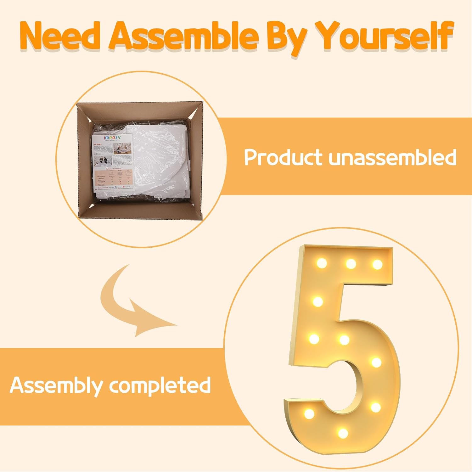 - Assembly Required: Our large marquee numbers is made from foam board and easy to assemble with our splicing mode. Just follow the numbered instructions to align and insert the bottom plate, and reinforce it with a hot glue gun. Then, you're done!