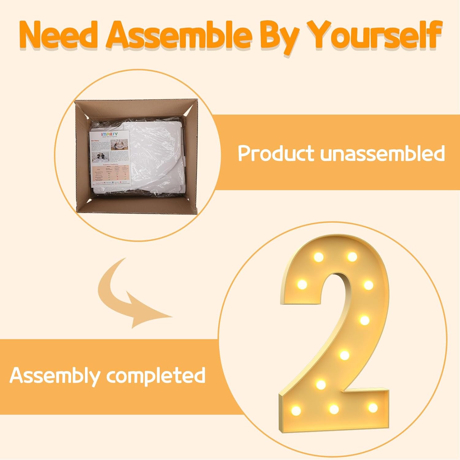 - Assembly Required: Our large marquee numbers is made from foam board and easy to assemble with our splicing mode. Just follow the numbered instructions to align and insert the bottom plate, and reinforce it with a hot glue gun. Then, you're done!
