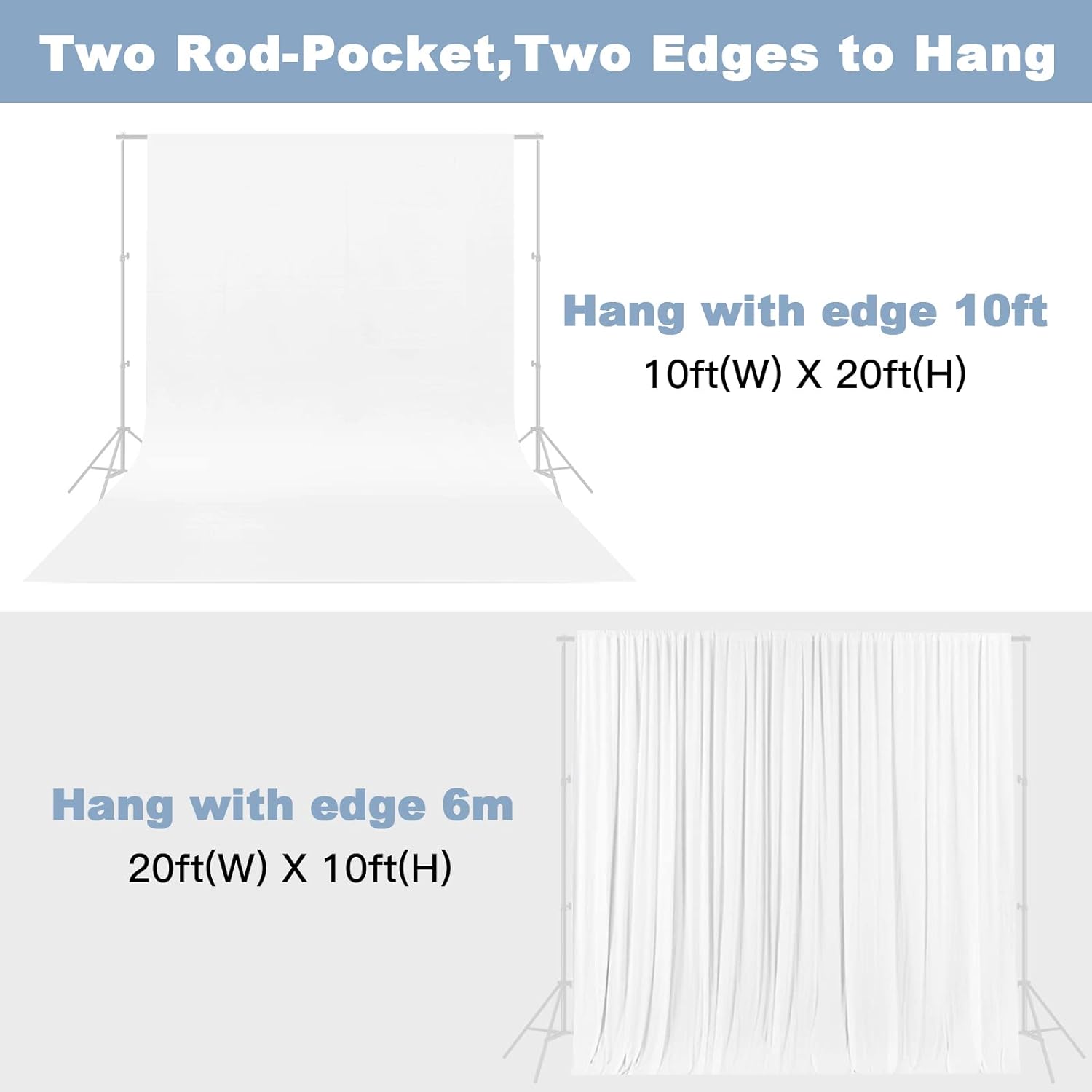 - 【TWO ROD-POCKET & TWO SIDES TO HANG】The white photo backdrop come with two pockets (2.36 inches), one on the short edge (10ft), and the other on the long side (20ft ). This white backdrop can work as a photography background with 10ft side hanged, and it can also work as a party curtain backdrop with 20ft side hanged.
