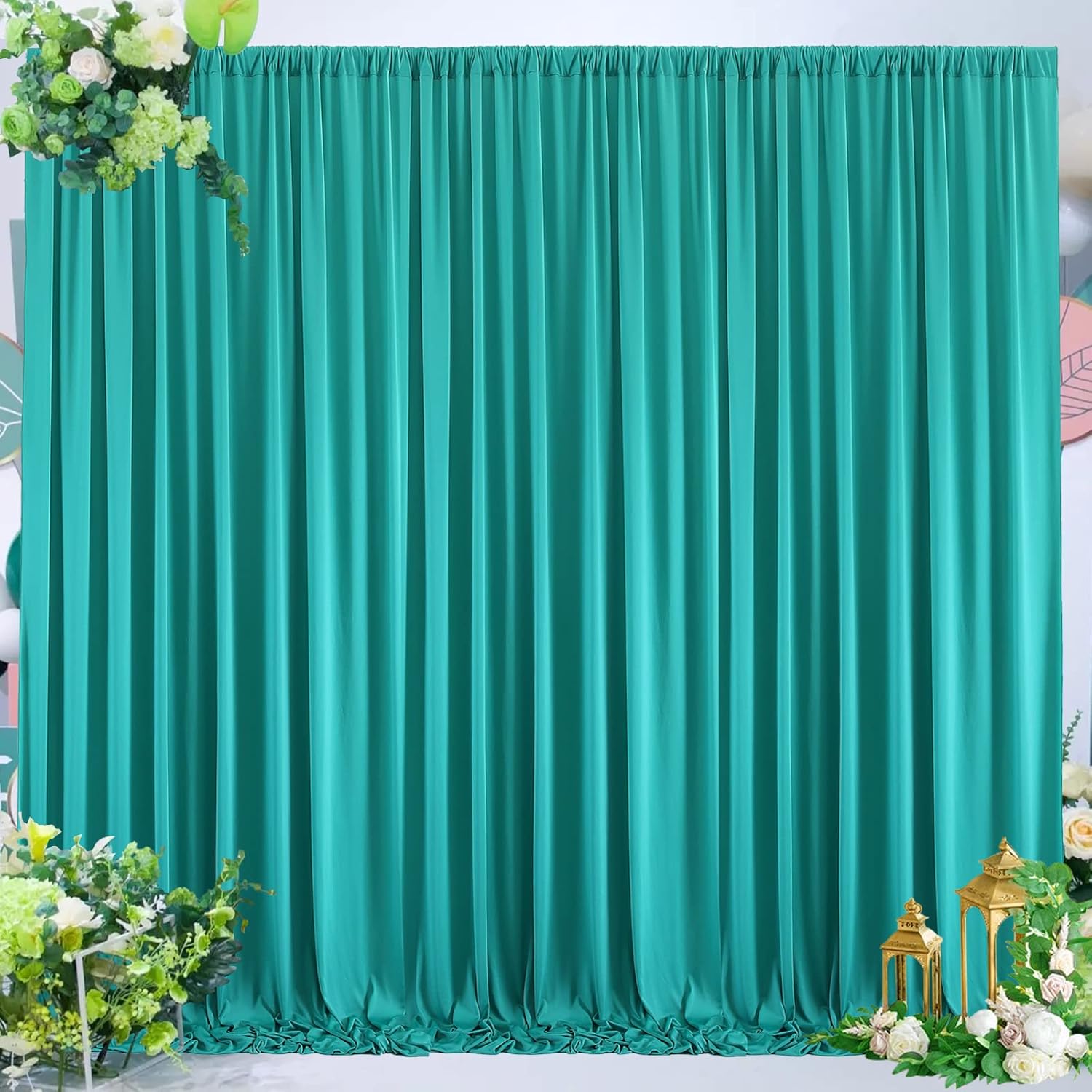 - Make Your Party Pops:You can add some flowers,greenery,balloons, party streamers, fun banners, balloon arch, butterflies, paper stars, tissue paper flower prop, confetti,twinkle lights to make your polyester backdrop for a gorgeous look! Teal wedding drapes for wedding can be hand wash or machine wash.