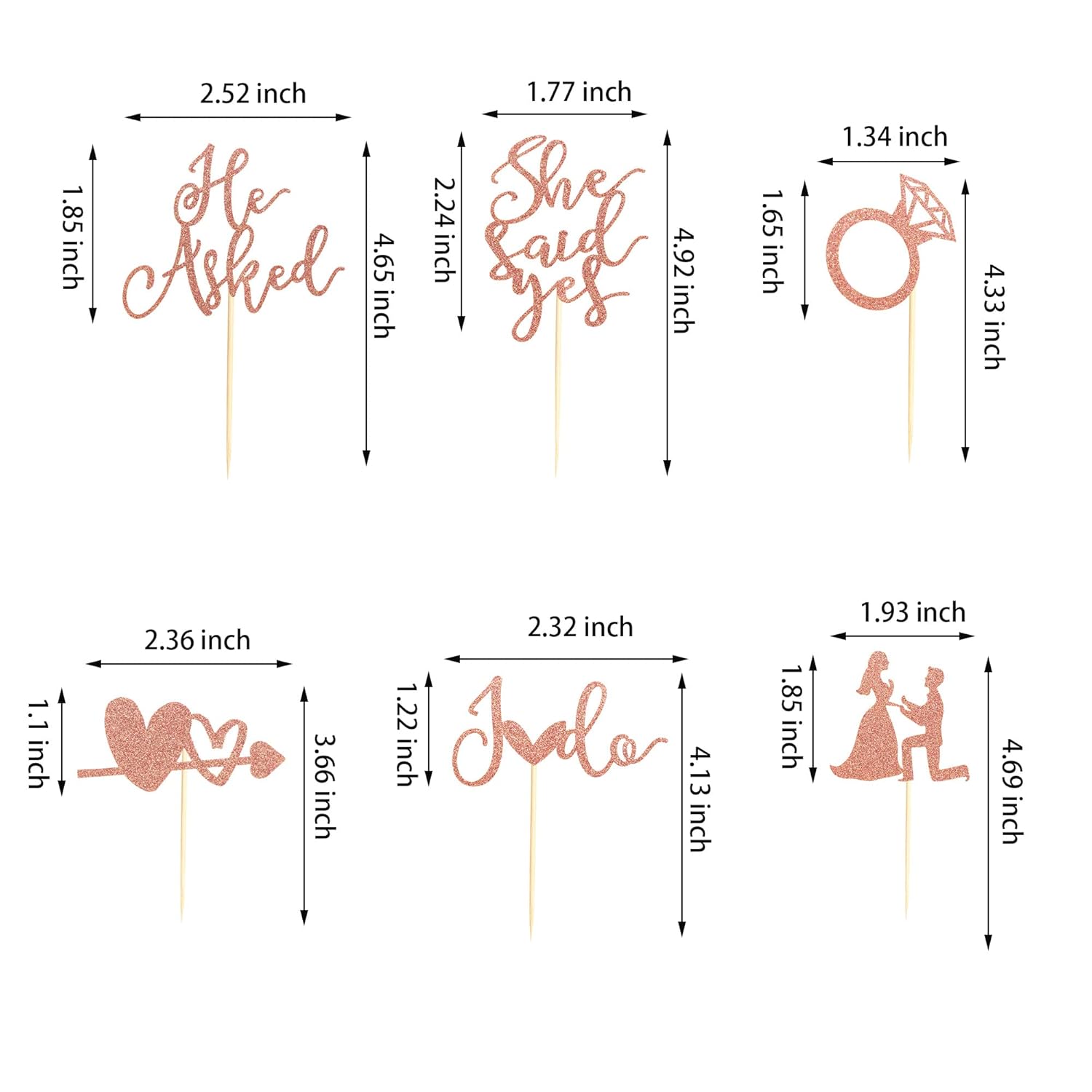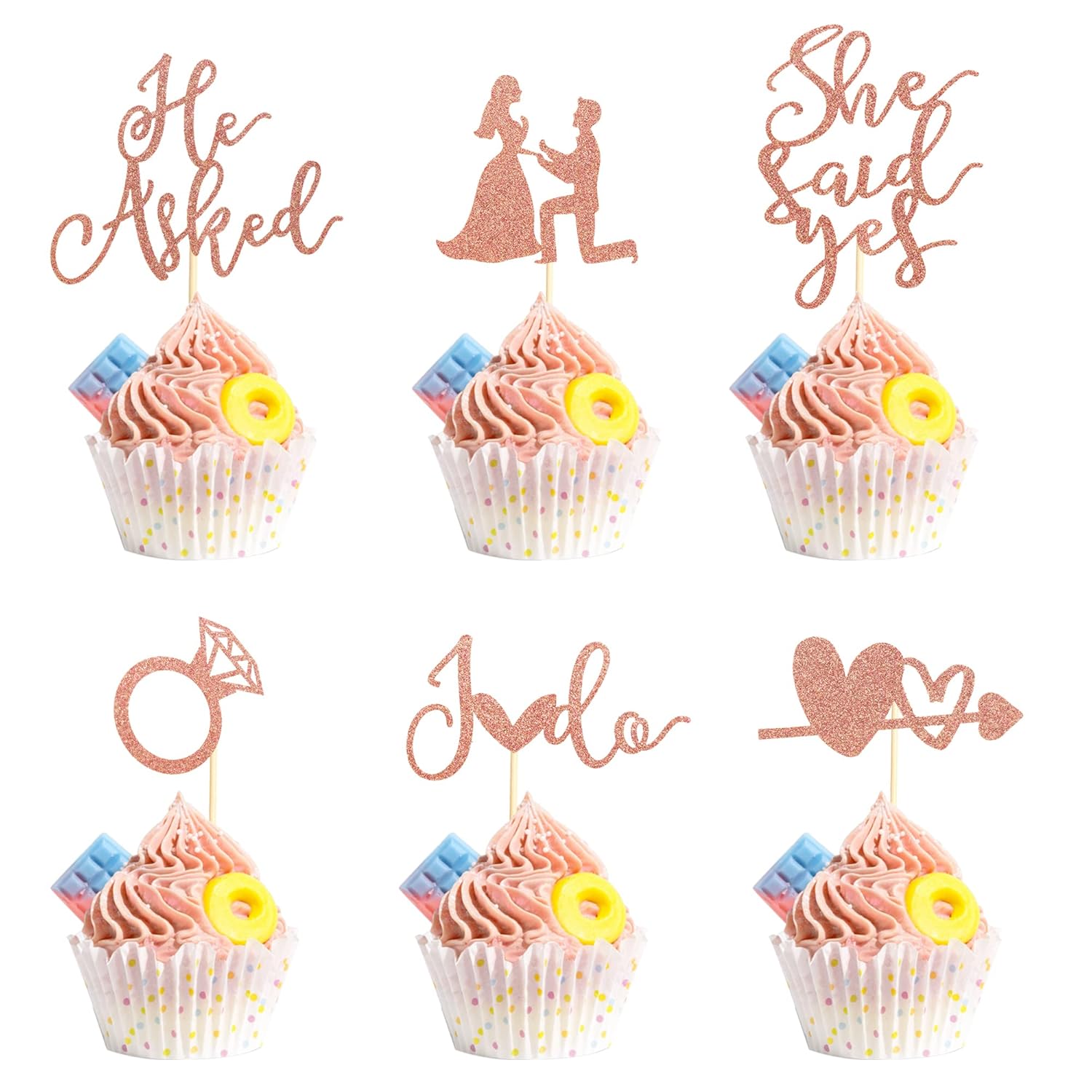 - Package include 24pcs rose gold glitter he asked she said yes cupcake toppers, 6 styles, 4pcs of each style.