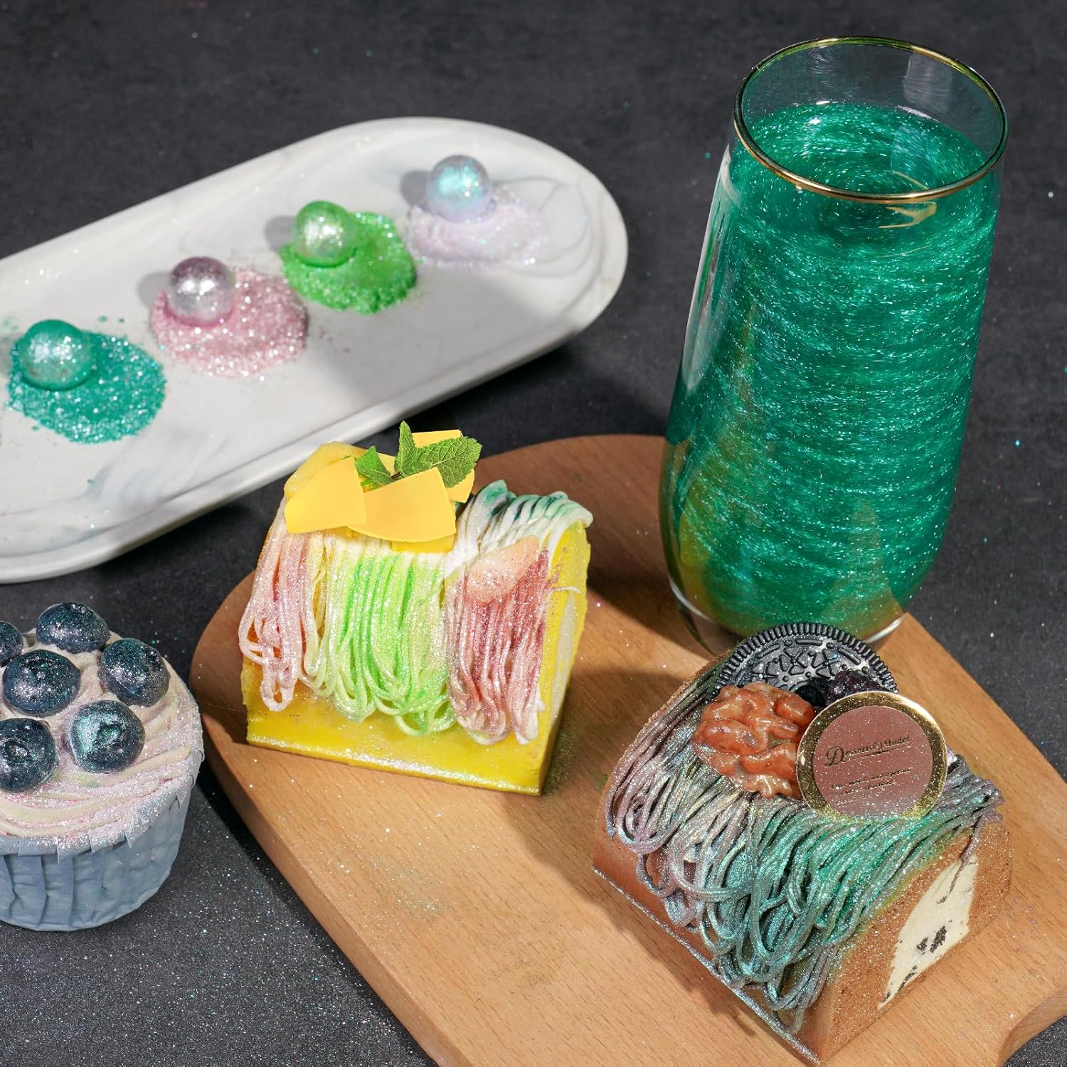- ✔️【Easy to Use】Specially developed for food decoration and craft industries, this luster dust produces realistic looks by highly pigmented colors with a metallic finish. The pretty fine grain is more convenient for painting. To add glimmer and sparkle to your creations, simply sprinkle or dry brush the luster glitters on them. This product adheres very well to both wet and dry mediums. Attention: Seal and store glitter powder in a cool and dry place after use. Do not expose to excessive heat.