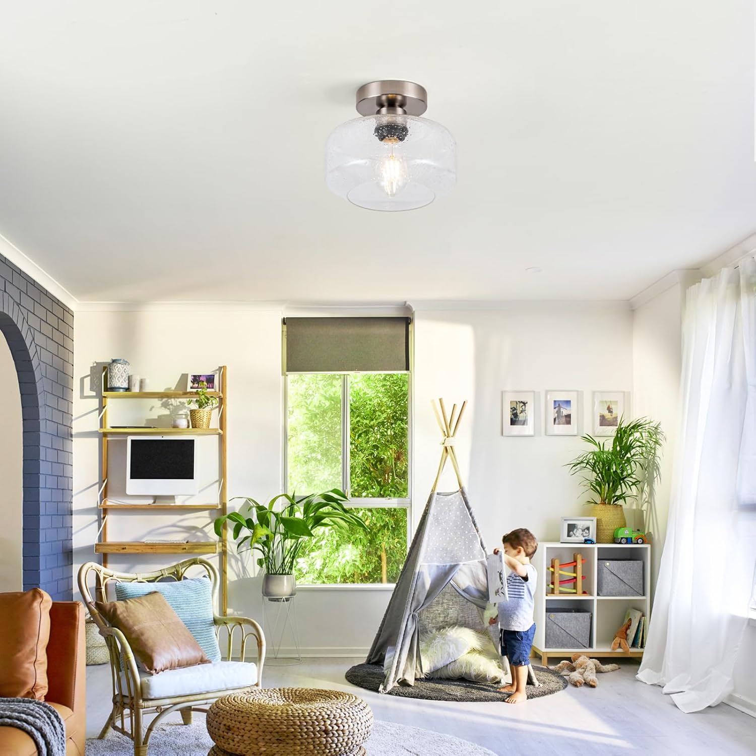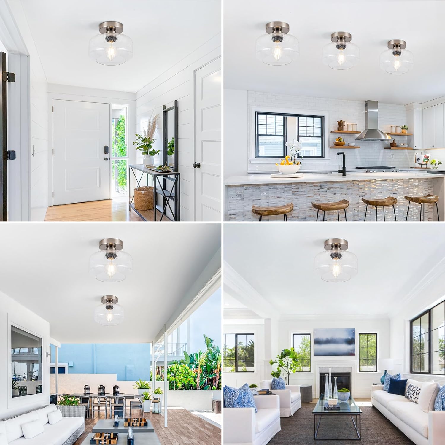 - 1.[ Vintage Style Semi-Flush Mount & Clear Seeded Glass: ] This elegant ceiling light fixture combines a vintage-inspired design with hand-blown clear seeded glass. The brushed nickel metal base offers durable, rust-resistant beauty. The seeded glass creates stunning, ambient shadows on your ceiling, elevating your decor.