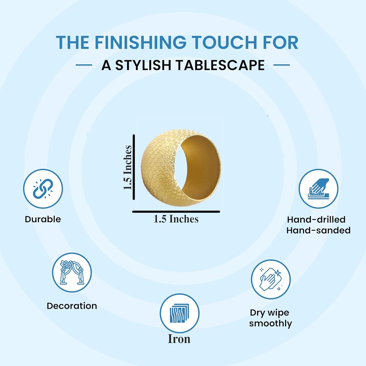 - β SET OF 12 -IDEAL SIZE FOR ALL NAPKINS: Each gold metal napkin ring measures 2 x 2 x 1 inches, designed to hold cloth or paper napkins with ease. Comes in a coordinated set of 12, perfect for creating a uniform and elevated table presentation.