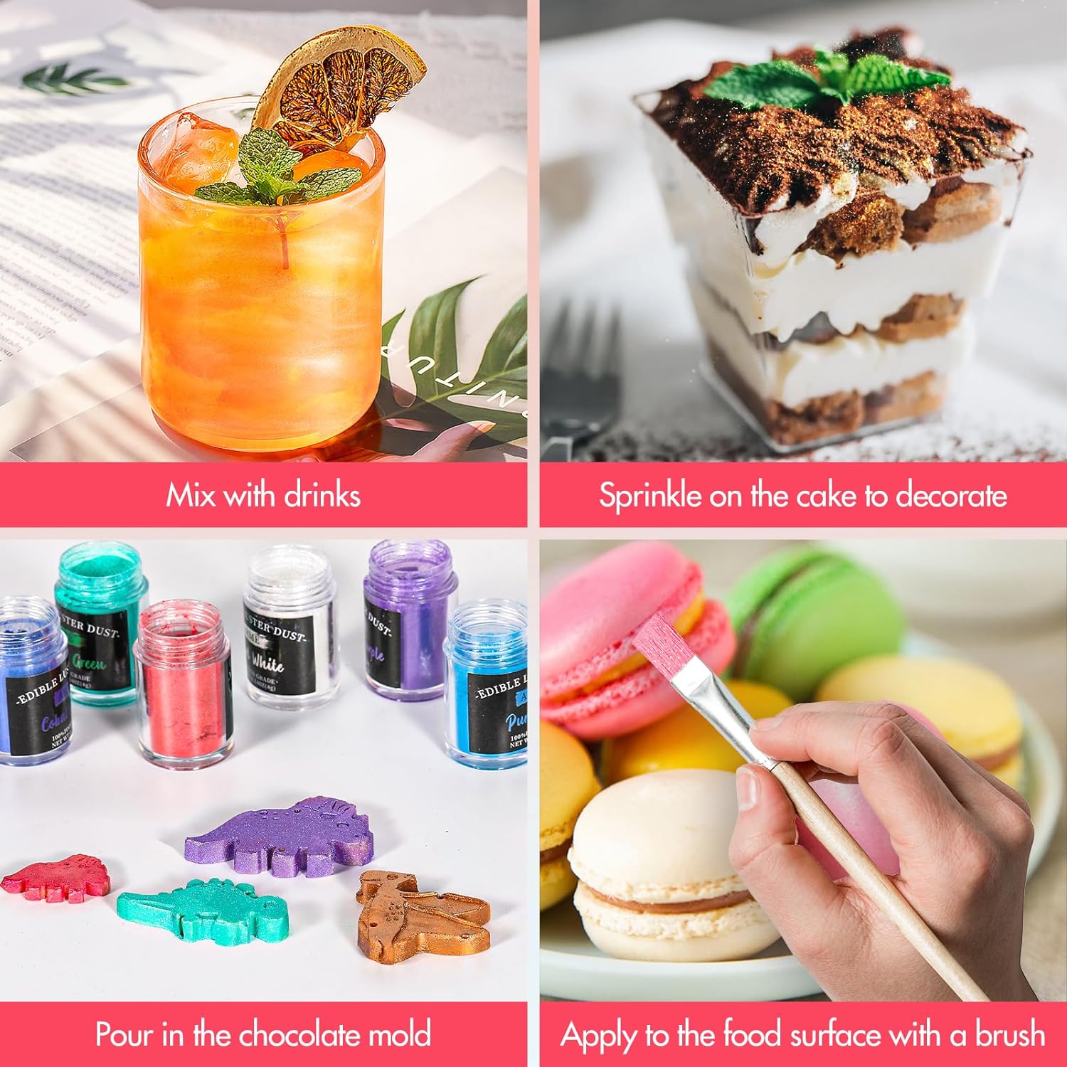 - 🍩【WIDELY USED】This colorful and vibrant edible drink glitter can elevate cakes, desserts, cookies, wine, cocktails, champagne and other baked goods by giving them amazing color and sparkle! Whether you want to make sparkling cocktail drinks or a unique cake, you can choose our dust powders. Also, they are suitable for various food industries such as bars, bakeries, etc. Note: Please store these luster powders in a cool,dry place after use and do not expose it to high temperatures.