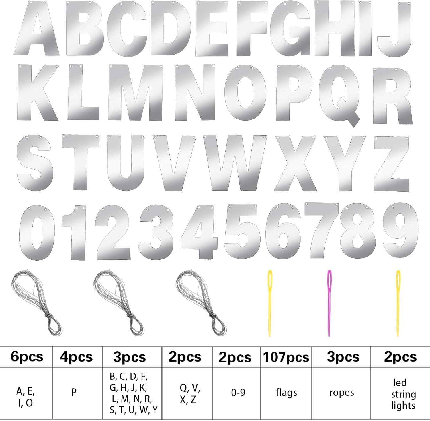 TaoBary 112 Pcs DIY Letter Custom Banner Glitter Customizable Banner Kit Including 107 Letters and Numbers 3 Rope for Valentine Birthday Party(Glossy Silver)