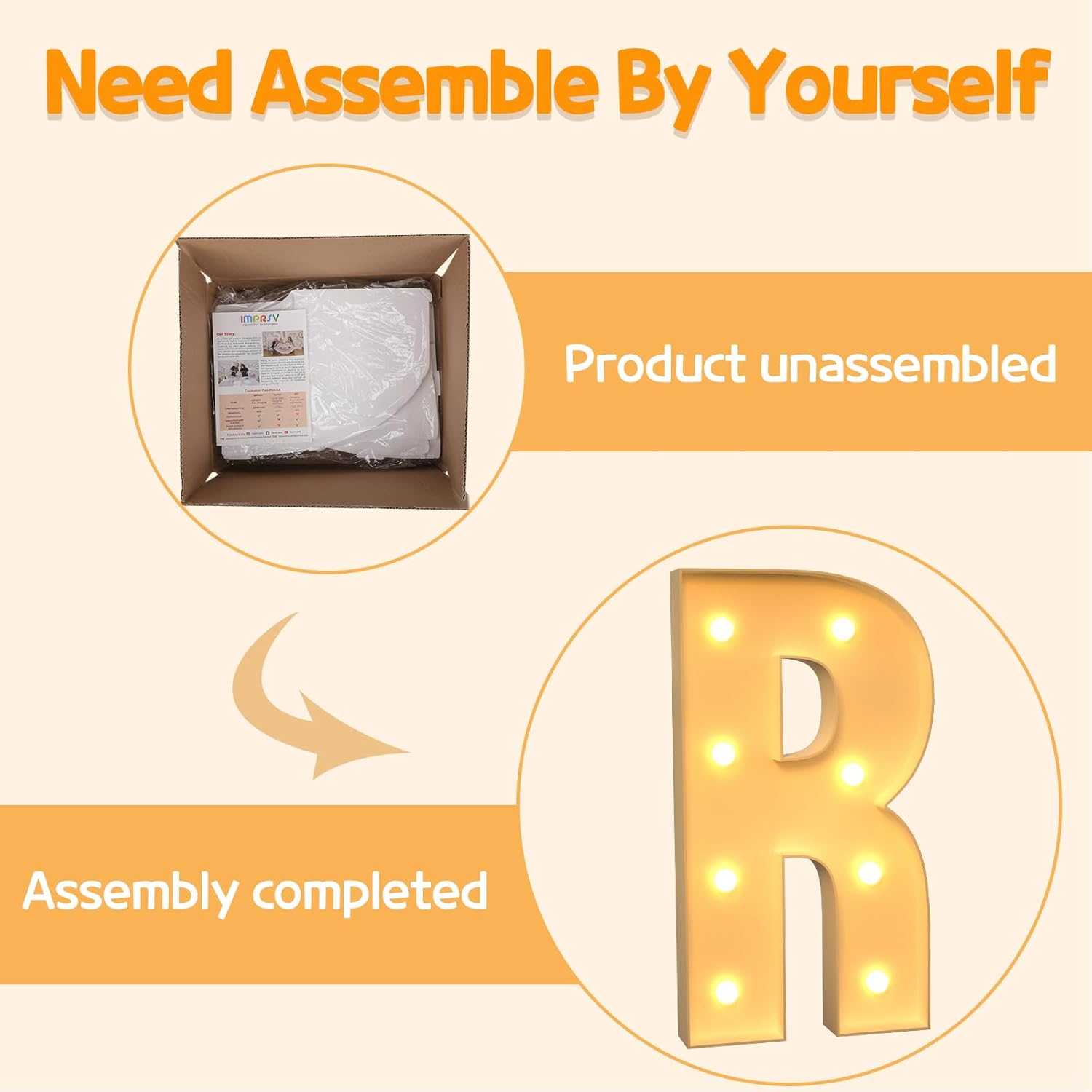 - Assembly Required: Our large marquee letters is made from foam board and easy to assemble with our splicing mode. Just follow the numbered instructions to align and insert the bottom plate, and reinforce it with a hot glue gun. Then, you're done!