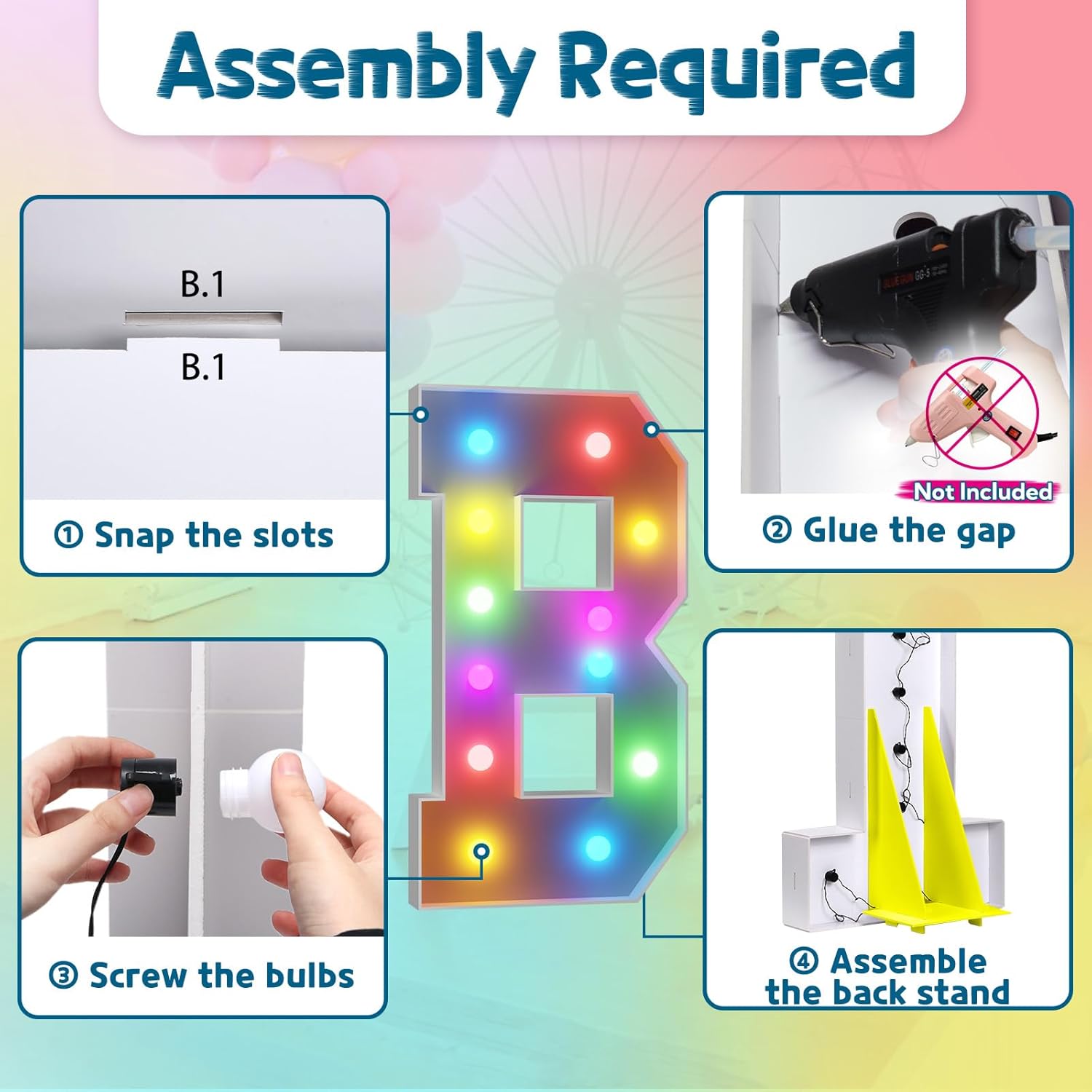- Assembly Required. To assemble the light up numbers and letters, a hot glue gun is necessary. We have conveniently pre-cut the numbers into several pieces for your convenience. Simply consult the included instruction manual to easily assemble the impressive 4 ft tall and 3ft tall marquee numbers and letters using a hot glue gun.