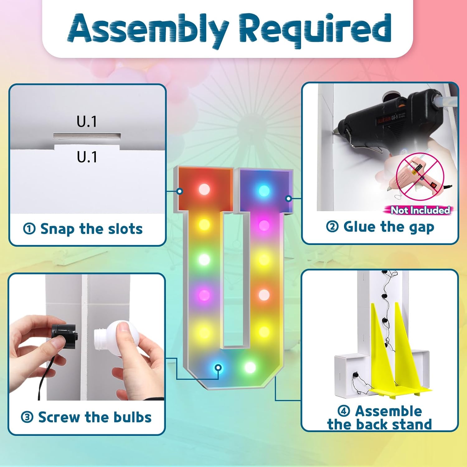 - Assembly Required. To assemble the light up numbers and letters, a hot glue gun is necessary. We have conveniently pre-cut the numbers into several pieces for your convenience. Simply consult the included instruction manual to easily assemble the impressive 4 ft tall and 3ft tall marquee numbers and letters using a hot glue gun.