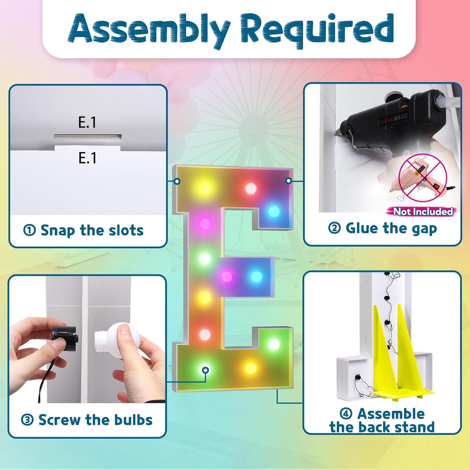 - Assembly Required. To assemble the light up numbers and letters, a hot glue gun is necessary. We have conveniently pre-cut the numbers into several pieces for your convenience. Simply consult the included instruction manual to easily assemble the impressive 4 ft tall and 3ft tall marquee numbers and letters using a hot glue gun.