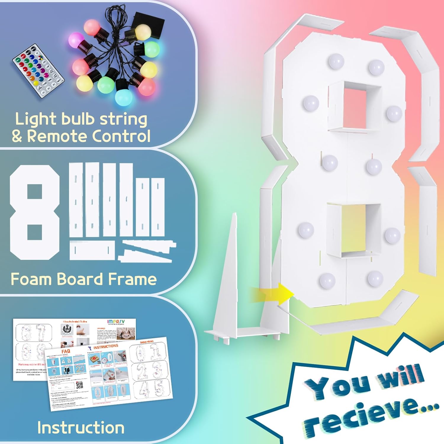 imprsv 4FT Colorful Marquee Numbers,18 Colors Number 8 with Remote, Light Up Sign for 8th Birthday Decorations Anniversary Party Decor, Pre-Cut Foam Board Kit, Mosaic Sign for Balloon
