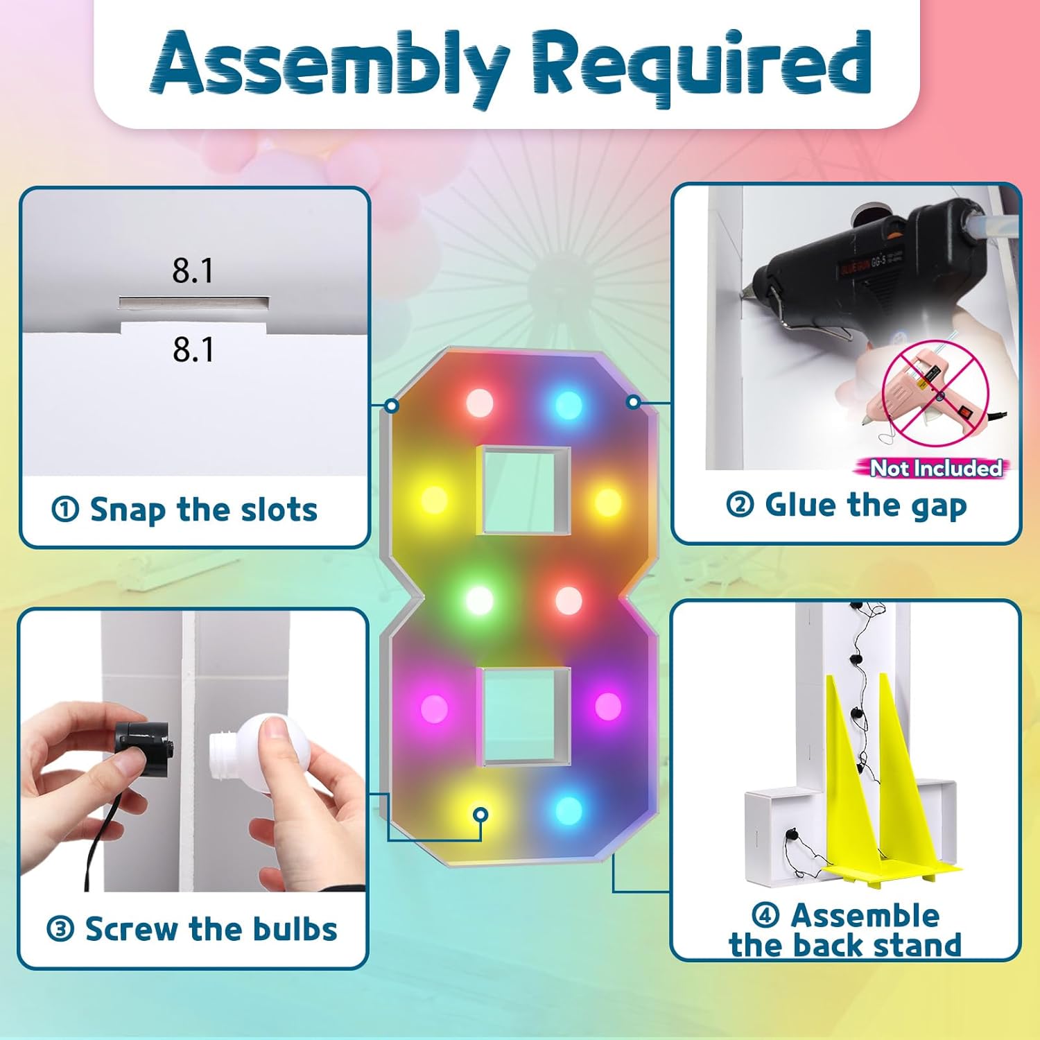 - Assembly Required. To assemble the light up numbers and letters, a hot glue gun is necessary. We have conveniently pre-cut the numbers into several pieces for your convenience. Simply consult the included instruction manual to easily assemble the impressive 4 ft tall and 3ft tall marquee numbers and letters using a hot glue gun.