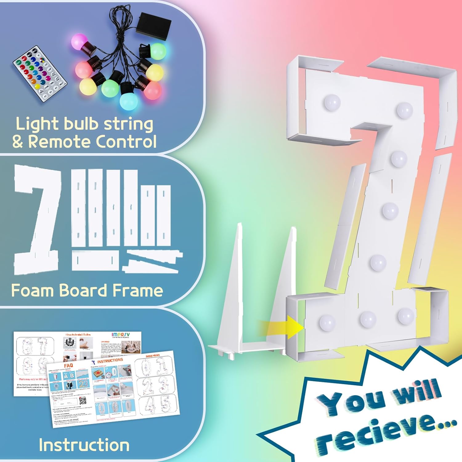imprsv 3FT Colorful Marquee Numbers,18 Colors Number 7 with Remote, Light Up Numbers Sign for 70th Birthday Decorations Anniversary Party Decor, Pre-Cut Foam Board Kit, Mosaic Sign for Balloon