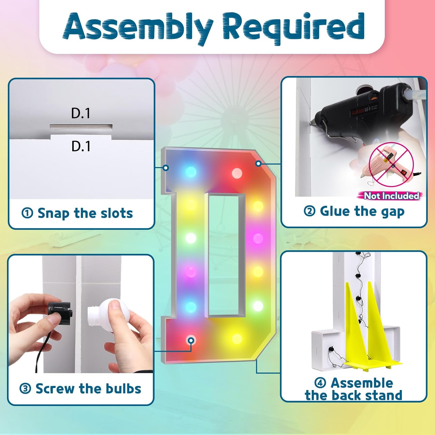 - Assembly Required. To assemble the light up numbers and letters, a hot glue gun is necessary. We have conveniently pre-cut the numbers into several pieces for your convenience. Simply consult the included instruction manual to easily assemble the impressive 4 ft tall and 3ft tall marquee numbers and letters using a hot glue gun.