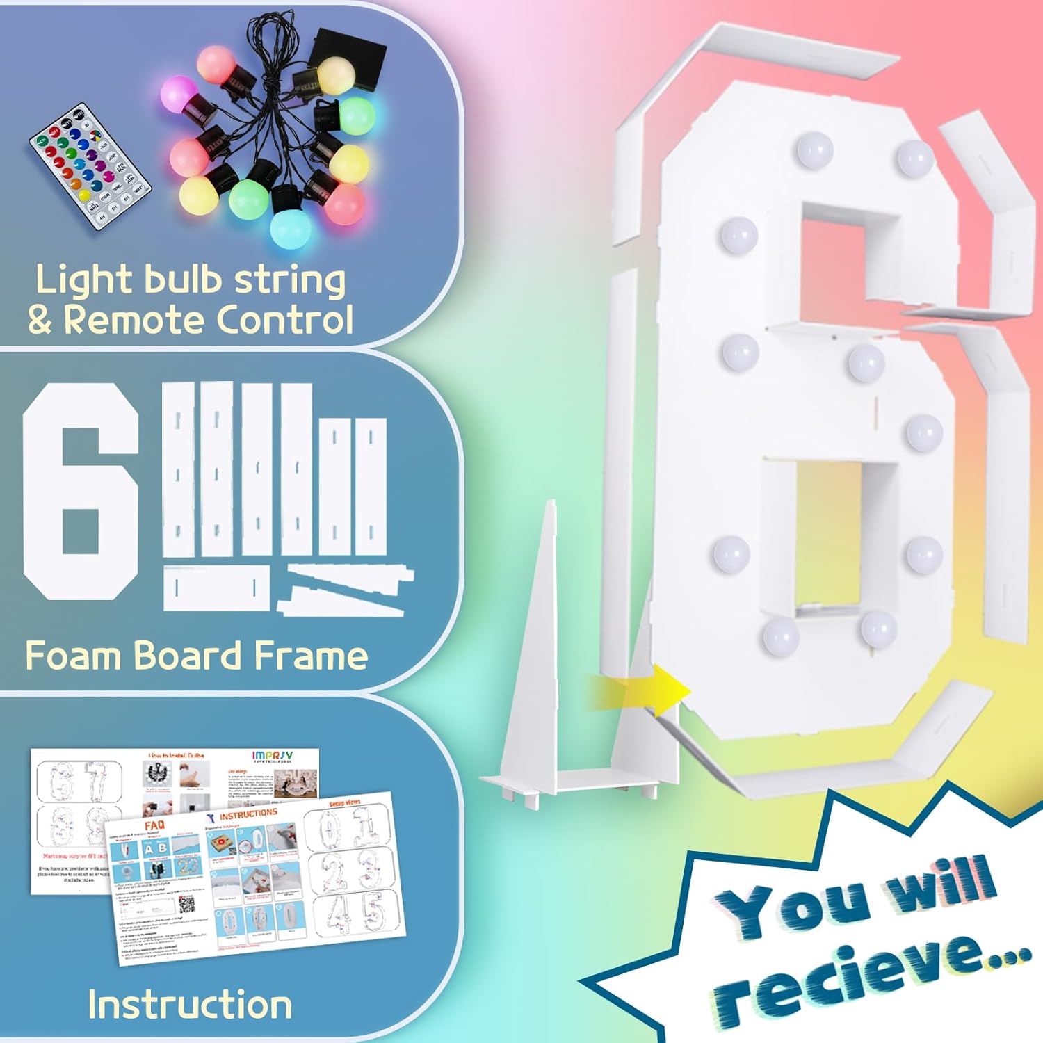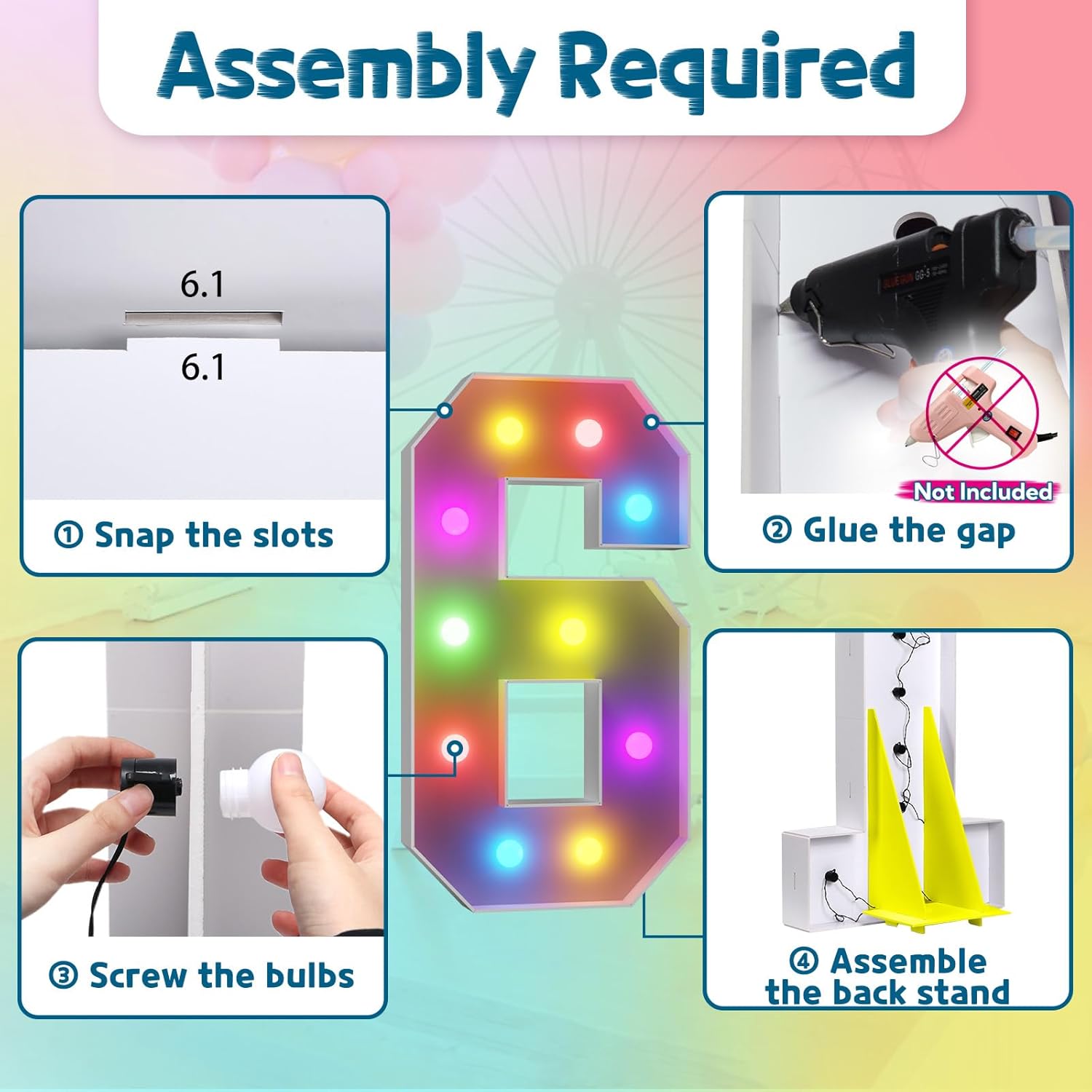 - Assembly Required. To assemble the light up numbers and letters, a hot glue gun is necessary. We have conveniently pre-cut the numbers into several pieces for your convenience. Simply consult the included instruction manual to easily assemble the impressive 4 ft tall and 3ft tall marquee numbers and letters using a hot glue gun.