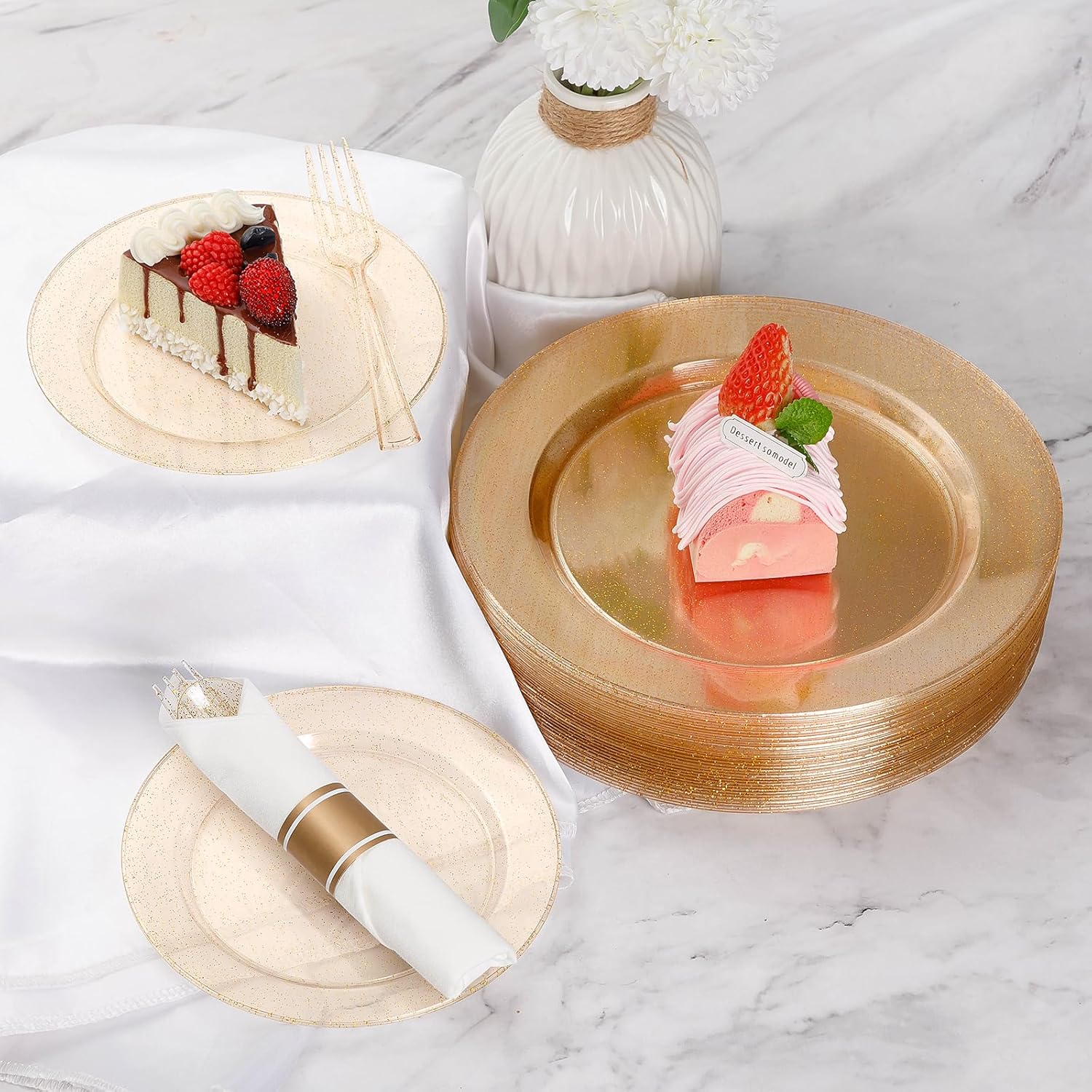 - ELEGANT DESIGN - These Gold Glitter wedding plates look premium and similar to porcelain. Their elegant appearance can meet the aesthetic requirements of all people, and they can be used for any occasion without a sense of incongruity.