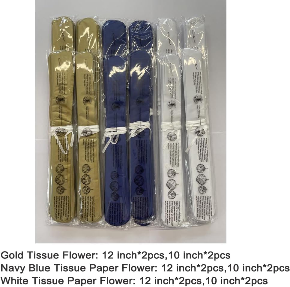 - Tissue Paper Flower Royal Blue and Gold 12pc in 2 sizes,package include gold crafts flower 4pc (2pc in 12'' and 2pc in 10''), royal blue crafts flower 4pc(2pc in 12'' and 2pc in 10''), white crafts flower 4pc(2pc in 12'' and 2pc in 10'')