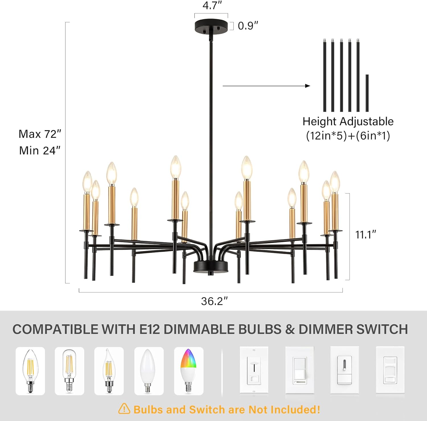 - Adaptable E12 Bulbs & Dimmers: The farmhouse chandelier uses 12 golden candelabra shaped E12 bulbs (max 40W/bulb), which are compatible with LED, incandescent, halogen and other types of bulbs, and can be matched with dimmers (bulbs and dimmers are NOT included). You can match different shapes and color temperatures of bulbs to create the appropriate atmosphere according to different activities, such as friend party, family dinner, chatting in the living room, watching movies in the bedroom, entry and staircase decorations and so on