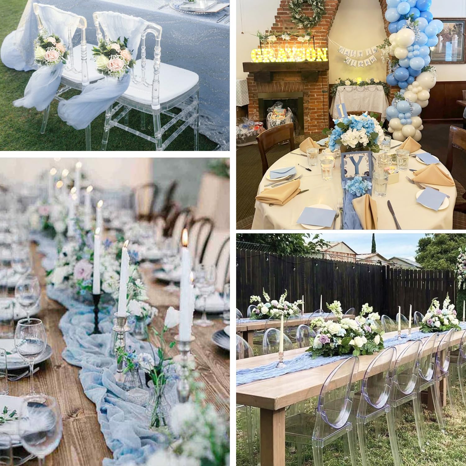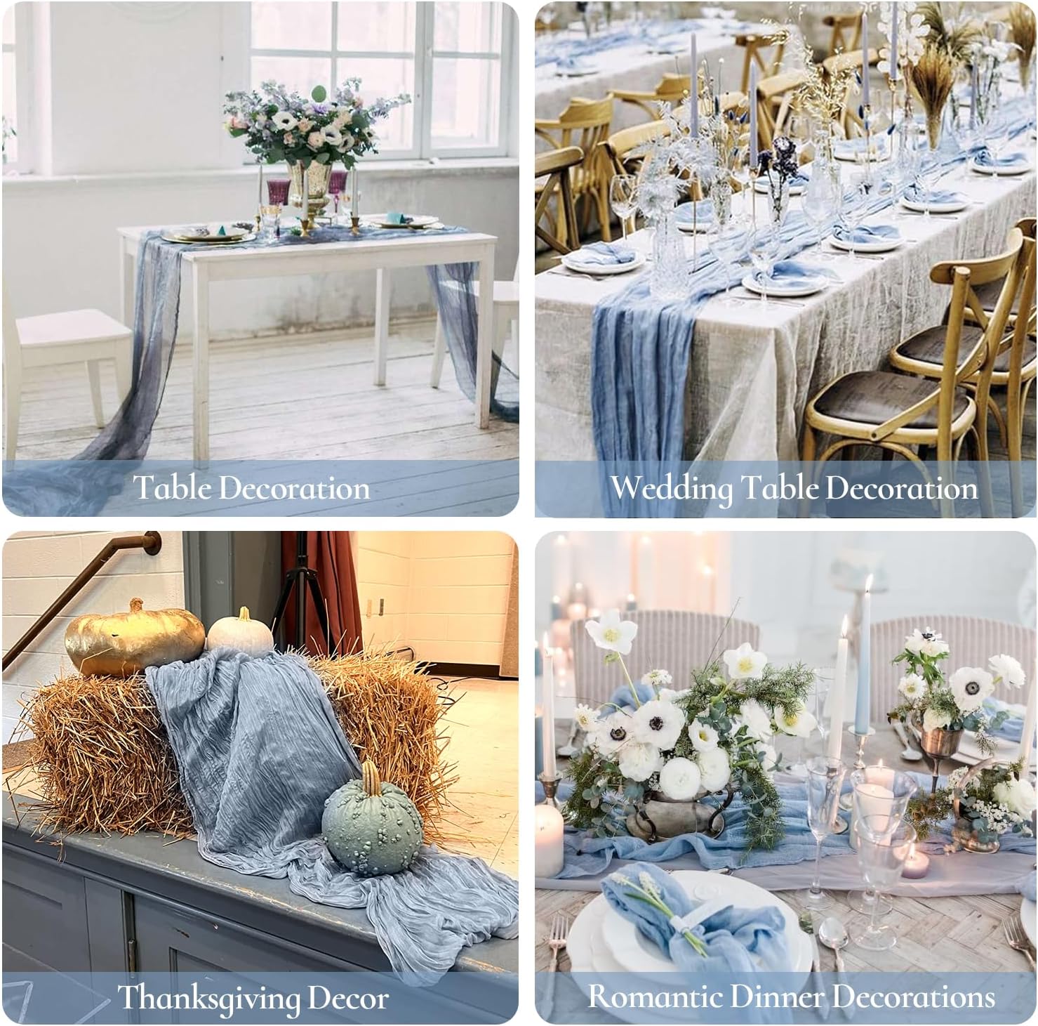 - 🍸【Versatile Dusty Blue Cheesecloth Table Runner】This boho-style table runner is perfect for any event, including weddings, banquets, bridal or baby showers, wedding arches, receptions, candy buffets, dessert backdrops, shows, photo booths, ceremonies, and many more special events&holidays. Dusty blue runner can also be applied to spicing up chair frames, home curtains, fireplace, shelf, cabinet, TV stand, sofa, bedside table, and any other furniture that needs a romantic touch. It's an excellent addition to any event decoration and gives a touch of elegance to your overall decor that is both romantic and charming.