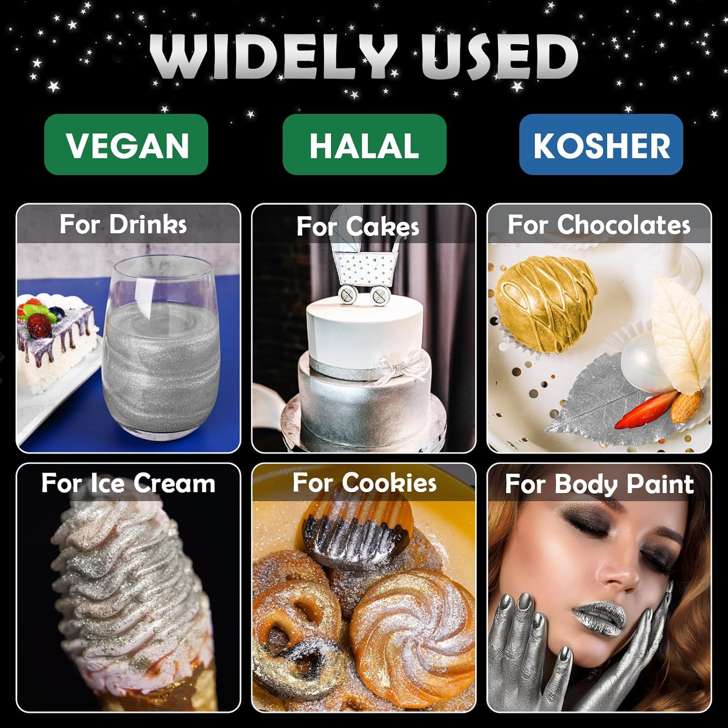 - 🌟【Vegan & Allergen-Free】Food-grade glitter uses only the highest quality vegan ingredients and does not contain common food allergens, including gluten, nuts or dairy products, so everyone can use and enjoy this product regardless of diet or food allergies. Unlike food contact glitter, these are 100% edible, so you don't need to worry about using them in your creations to make them sparkle for all.