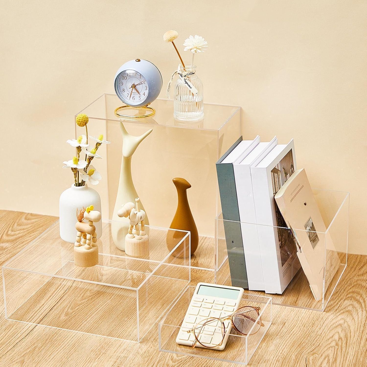 - Clear Aesthetics: our acrylic display stands showcase a simple yet elegant design; The clear color offers an unobstructed view of your displayed items, enhancing their beauty and visibility; Whether it's jewelry, cakes or other products, these cubes ensure they are the center of attention