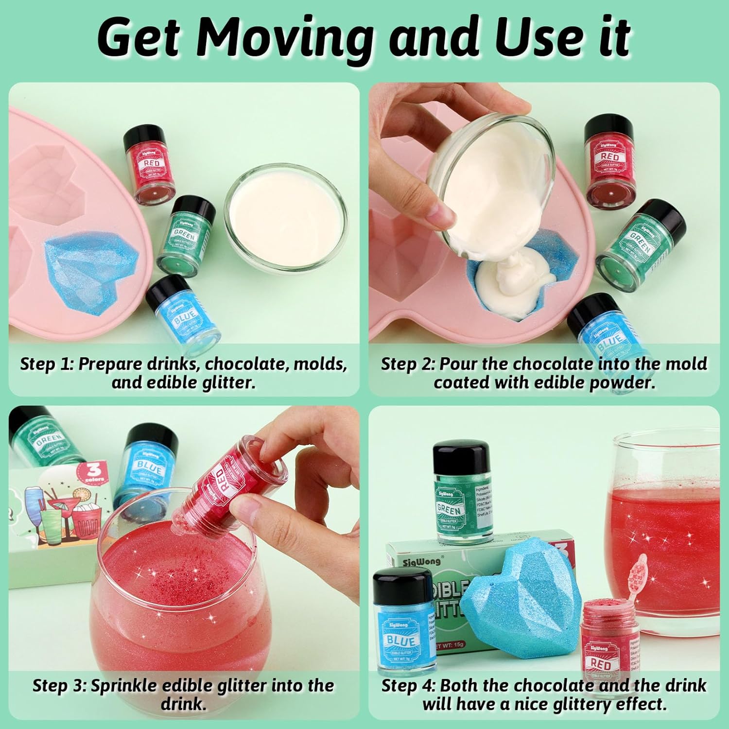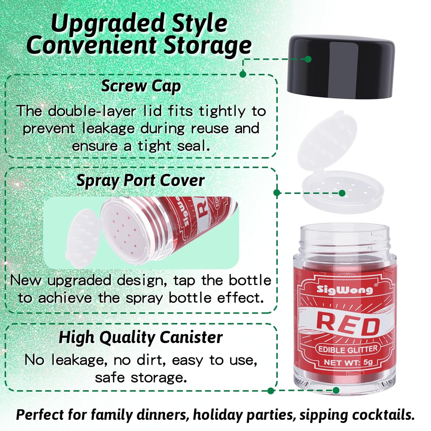 - Edible Glitter Set - 3 colors edible glitter for drinks ( red, green, blue ). 100% edible food-grade glitter powder in 0.18 oz/5 g size to meet your needs in breweries, distilleries, restaurants and food service industry.