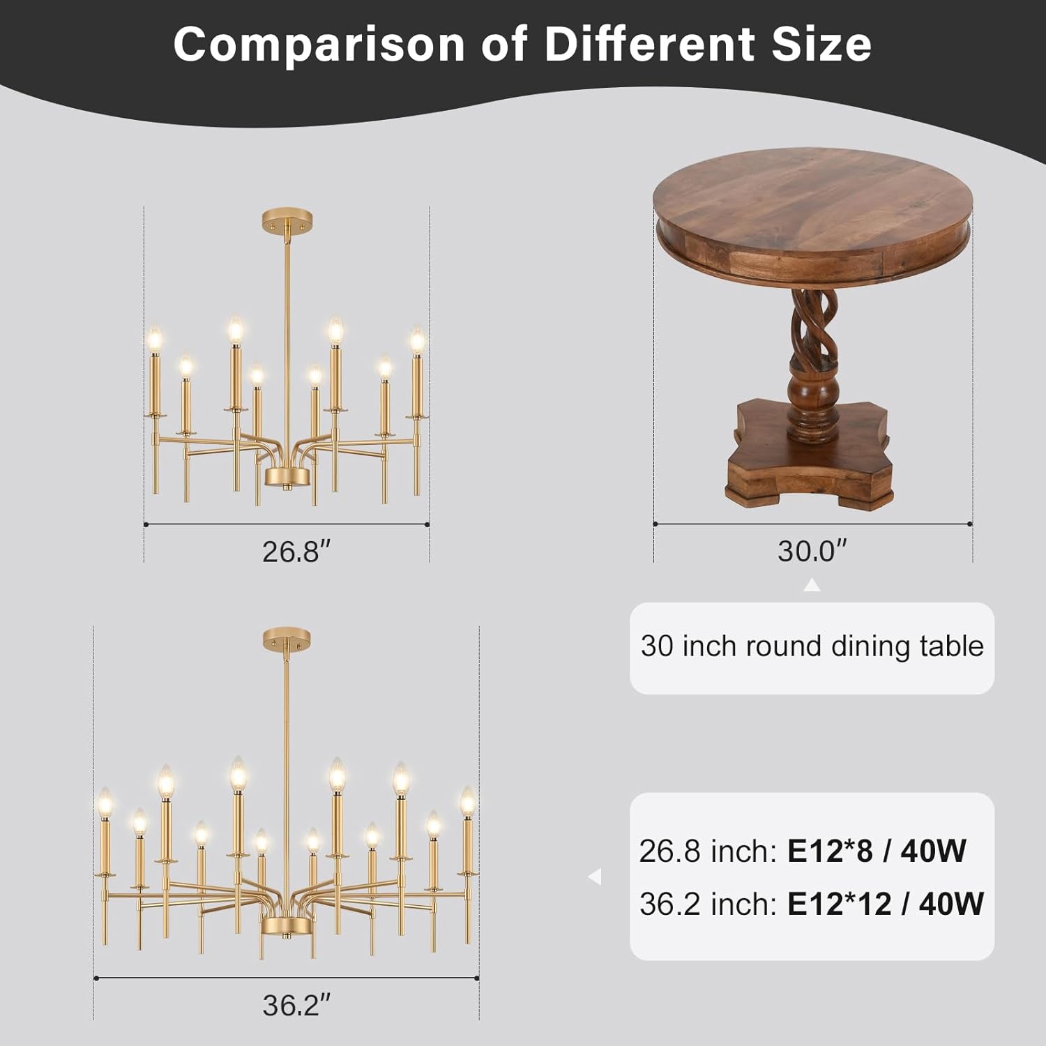 - Dimmable and E12 Bulb Compatibility: With 12 E12 candelabra sockets, this gold chandelier is compatible with various E12 bulbs (incandescent, LED, CFL, and halogen, 40W MAX / bulb), offering dimmable functionality to create the perfect ambiance. This gold matte chandelier allows for flexible lighting control, making it suitable as a gold chandeliers for dining room, or master bedroom chandelier (NOTE: bulbs and dimmer are NOT included)