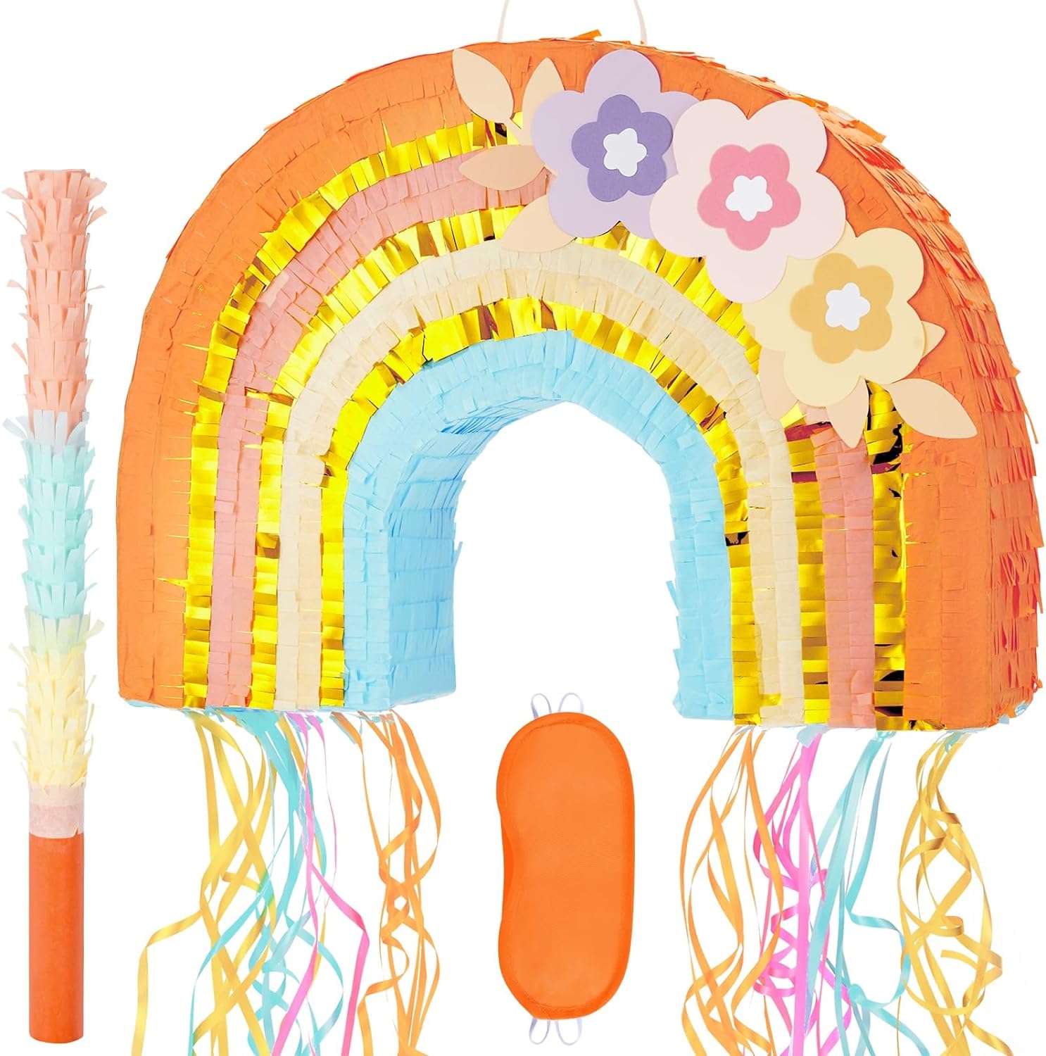 - 【DELICATE COMBINATION】 - This kids piñata party game set contains a rainbow piñata, a orange matched eye mask and 1 piece stick. With our piñata party supplies, get ready for a fun-filled game without additional preparation!