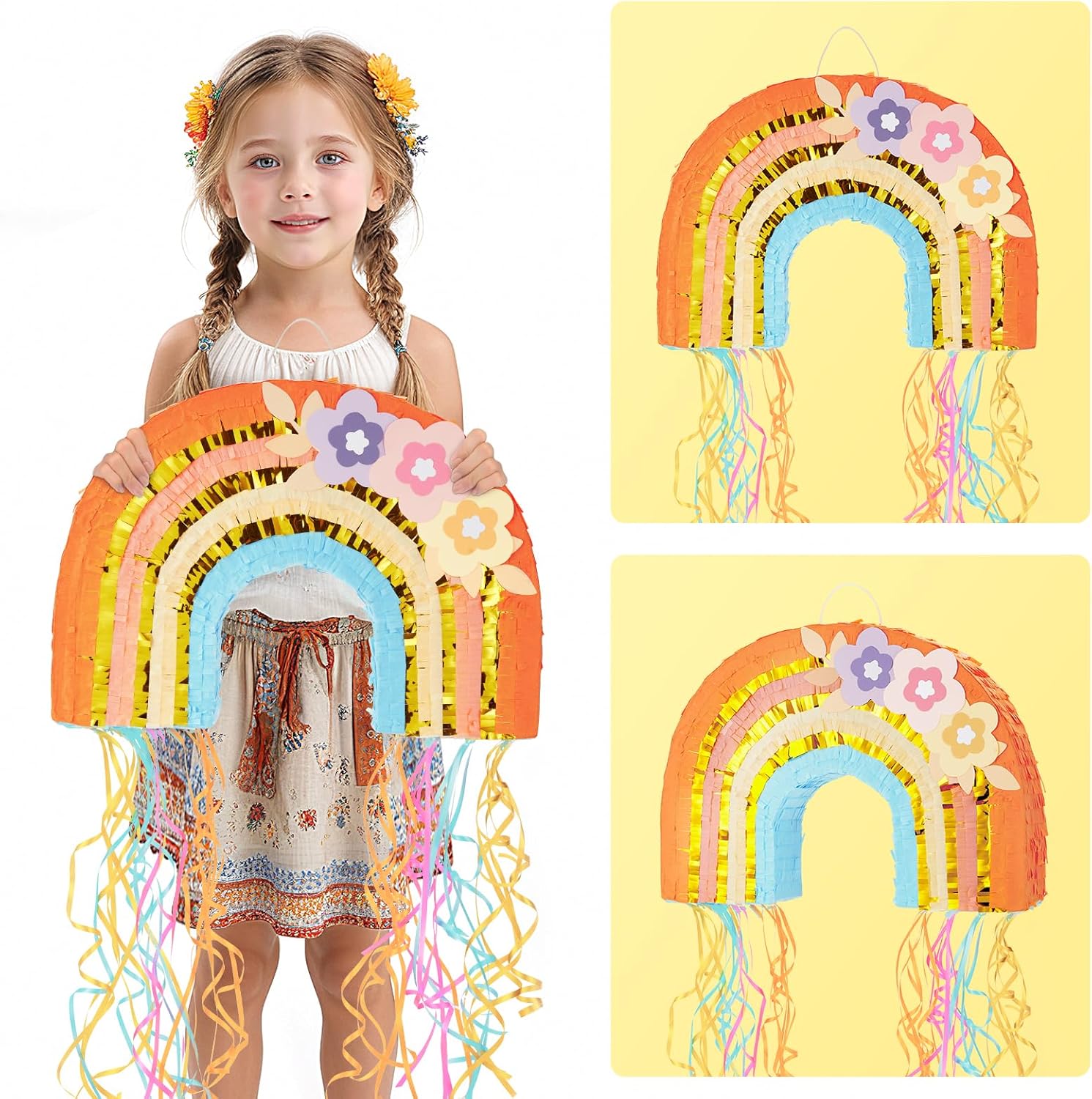 - 【VERSATILE DECORATION】 - Perfect for children's parties and festive gatherings, our colorful rainbow piñata is a versatile party decoration that promises hours of fun. Also you can use it as home decor or photo prop to make it a addition that will instantly elevate the atmosphere.