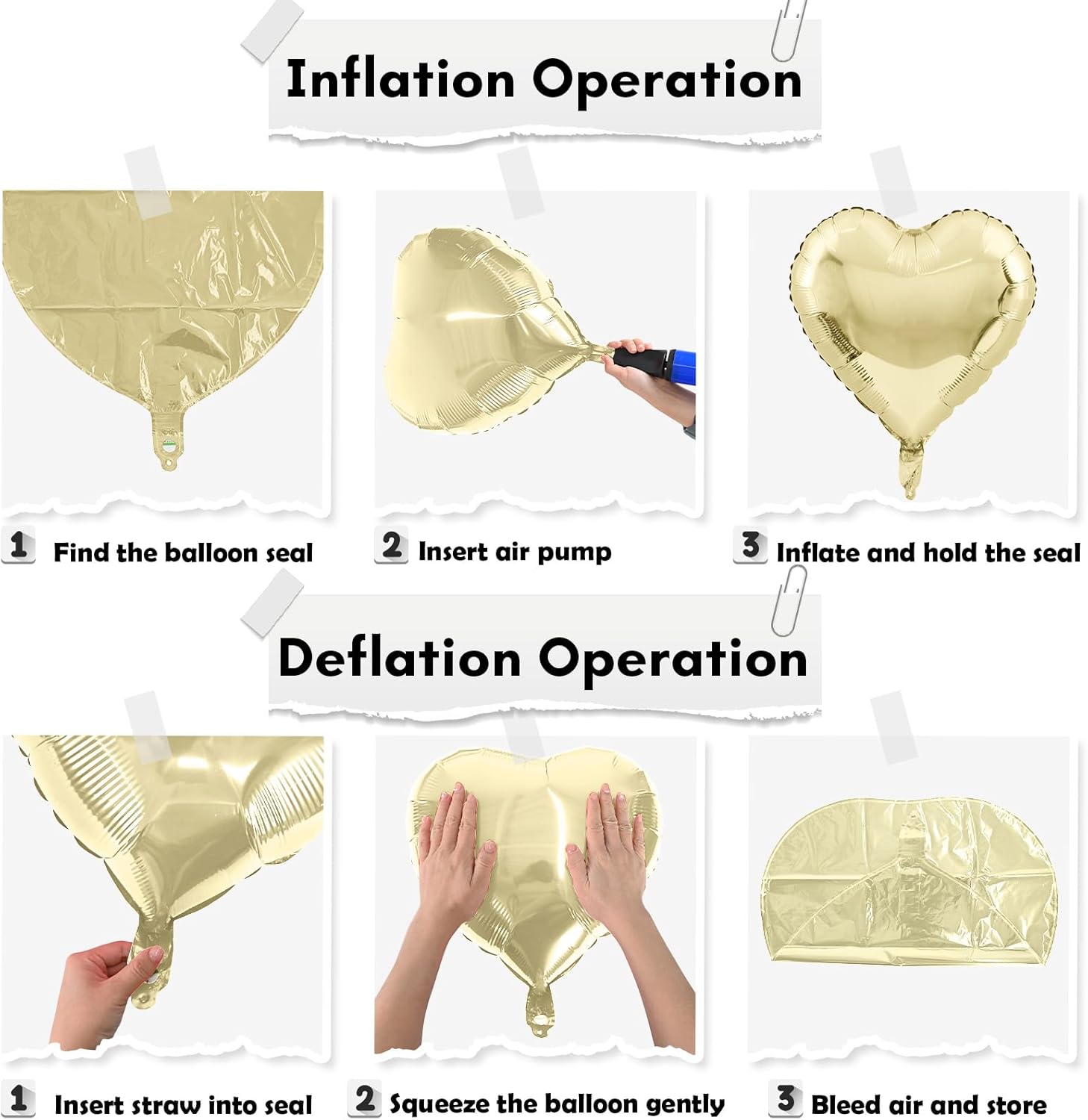 - Easy to Use: The heart foil can inflate with helium or air, can be self-sealed. It is recommended to inflate to 85%-90% to prevent the balloon from bursting.