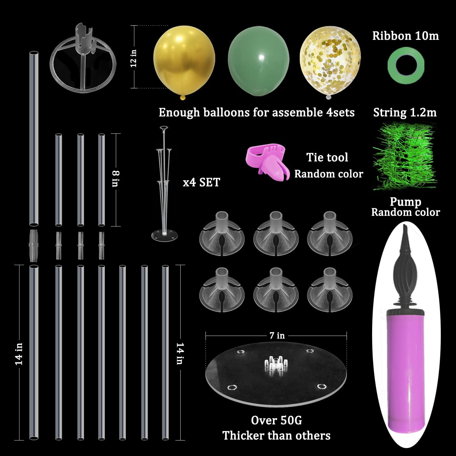 - WHAT INLCUDE: This balloon stand kit include 4 set balloon holders, 35pcs balloons - green balloons, gold and confetti balloons, balloon pump, ribbons, glue dots and tie tool