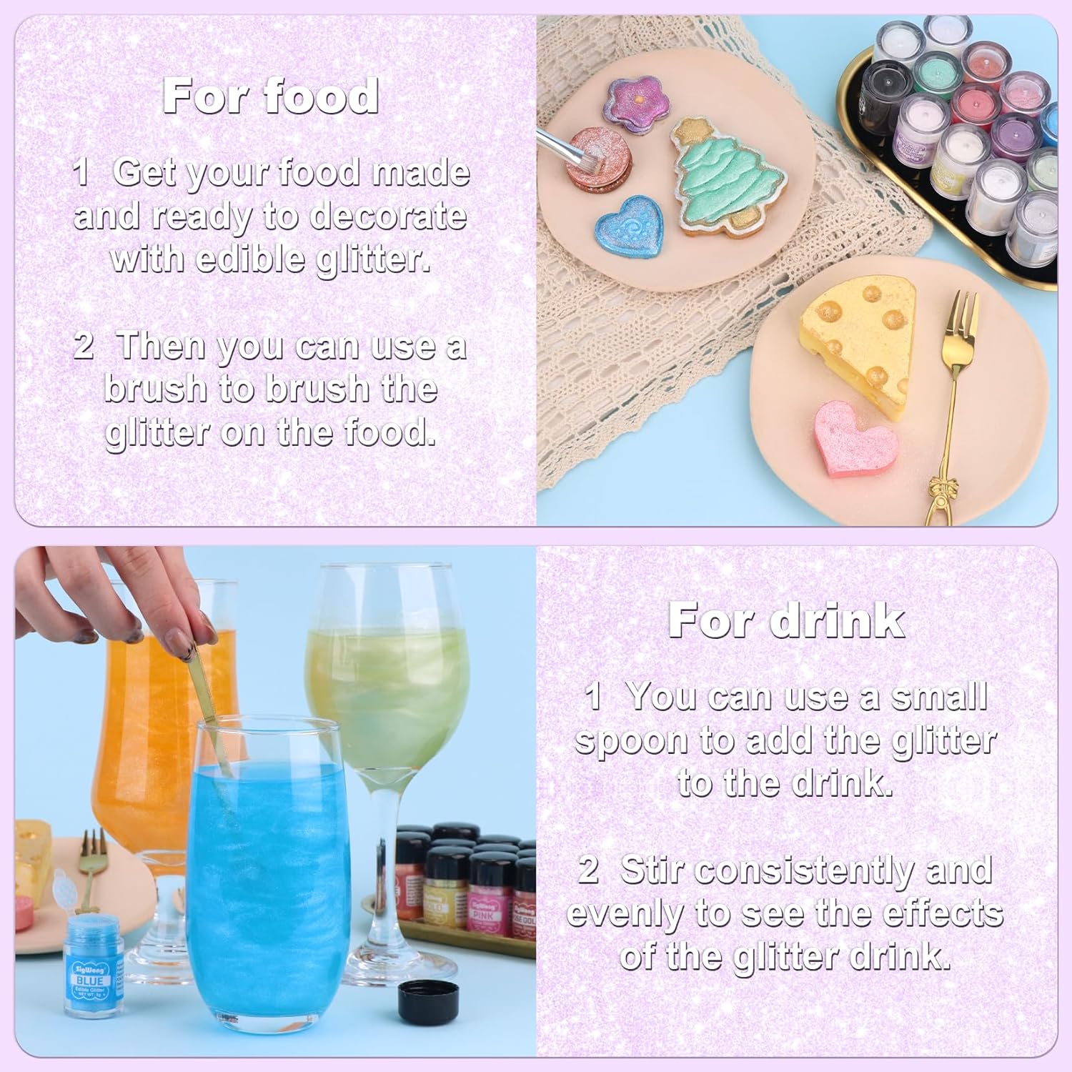 - 【Edible Glitter】: We offer edible glitter in a variety of colors, so you can match them to your party theme or personal preference to add a gorgeous shine to your drinks or baking!