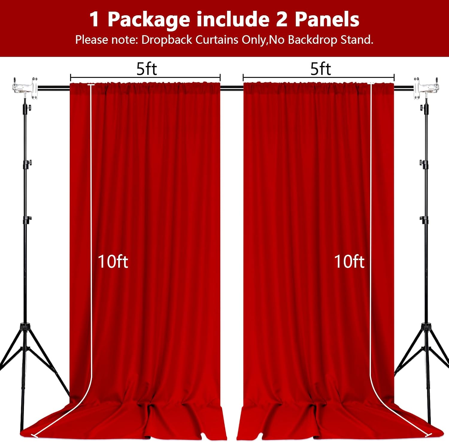 - DIMENSIONS: Each order is for 2 (two) polyester curtains. Each curtain measures 5 feet wide x 10 feet high. Entire backdrop measures 10 feet wide x 10 feet high.Each curtain panel comes with 4 inch rod pocket on top, fit up to any standard rods. (Please note: Dropback Curtains Only,No Backdrop Stand.)