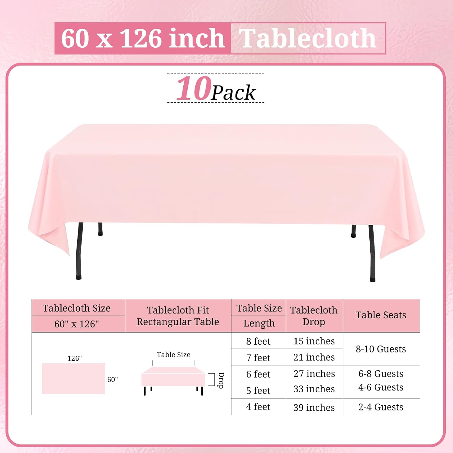 - 【Perfect size】: This pink table cloth is 60 inch wide and 126 inch long, cut entirely from a single piece of fabric, perfect for standard 8ft table, providing 15 inch drop. Pink tablecover is more luxurious, classic and gracious, ideal for both formal & casual settings and makes a great gift for all occasions.Upgrade your special moment and daily life with an exquisite taste.