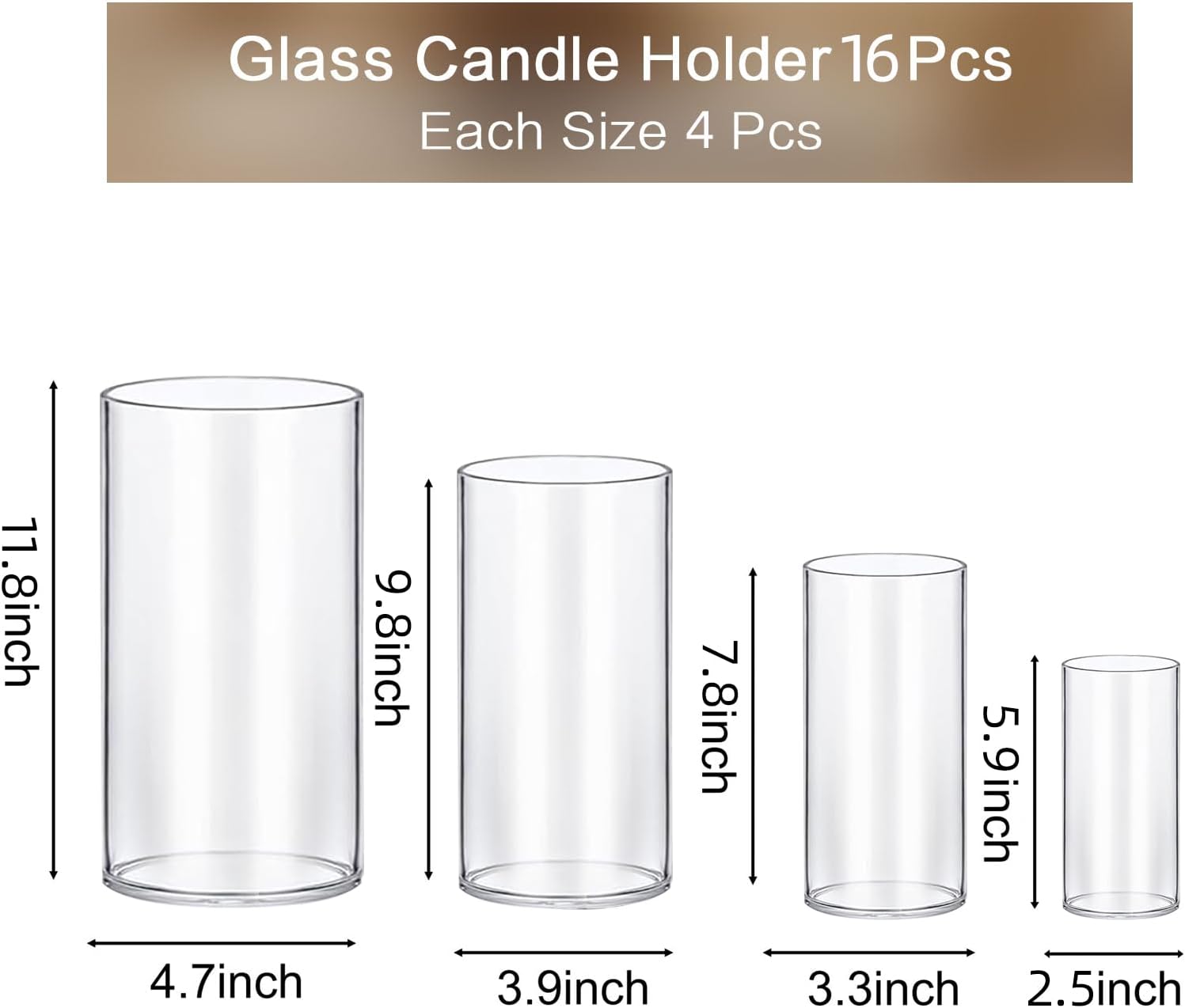 - 4 Different Sizes Candle Holder: The set glass candle holder includes 4 different sizeโLarge Size: width 4.7'' x height 10'', Medium Size: width 3.9'' x height 7.8'', Small Size: width 3.3'' x height 5.9'', each size 4 pcs, It can be used as a pillar candle holder, floating candle holder, and vase for flowers, which is the ideal choice for modern home decoration