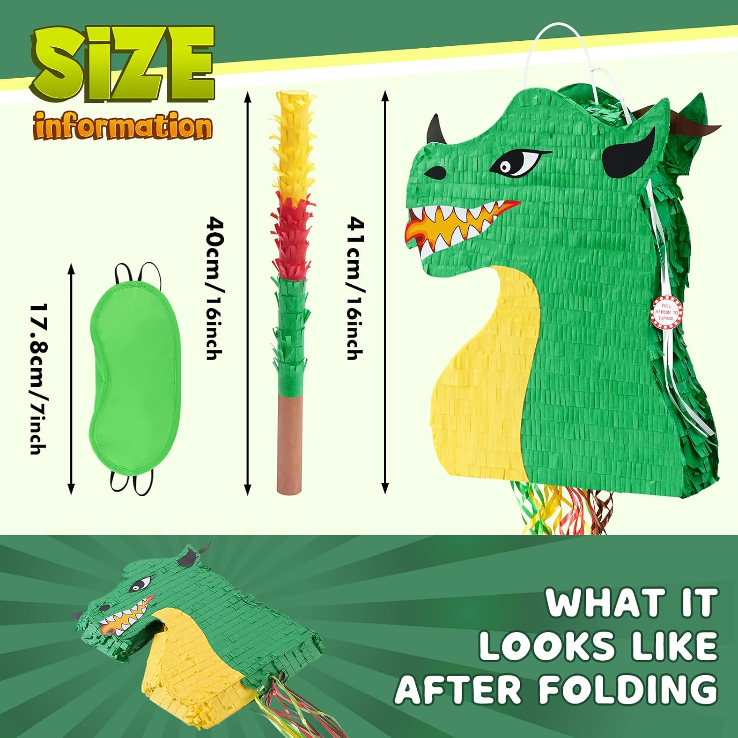 - PIÑATA SET PACKAGE - The collapsible dragon piñata set includes a dragon piñata, blindfold, bat, and hole seal stickers. You can use them to start your party game right away without additional preparation. Perfect for birthday parties, dinosaur themed parties, children's carnivals and other similar events.