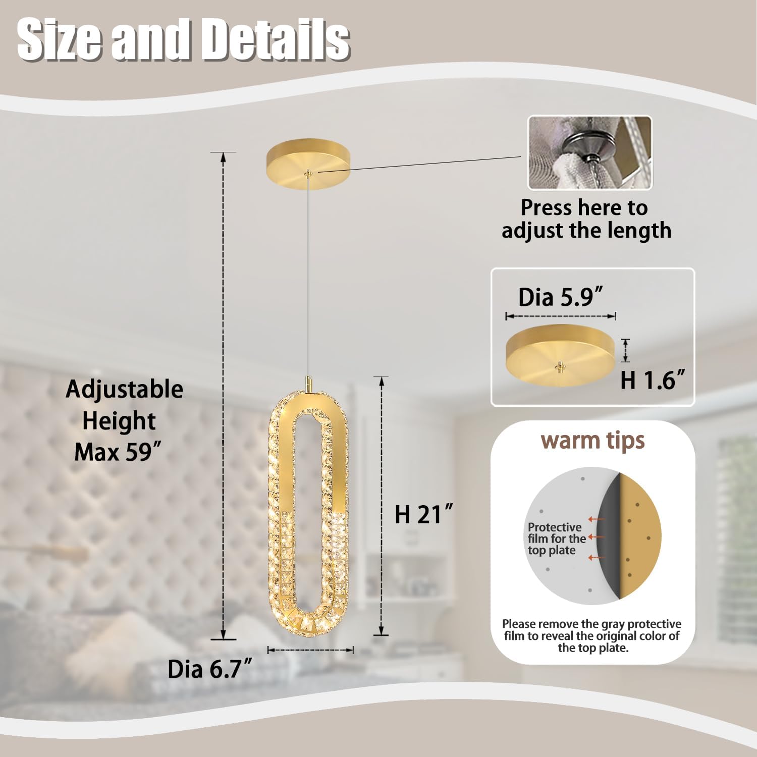 - 【Pendant Light Size】: Made of gold metal and crystal, the pendant light features a gold circular ceiling pan with a diameter of 5.9 inches. The crystal lamp shade has a diameter of 6.7 inches,H 21 inch. The pendant light has an adjustable cord and a total length of 59 inches, allowing you to choose the suitable height for your space.