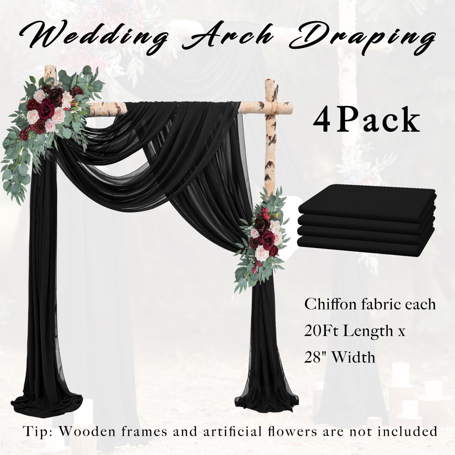 - Wedding Arch Drapes Fabric Package: Set consists of 4 black transparent arched curtains, each 20Ft Length x 28" Width, The dimensions of each piece have been precisely measured and there is not much difference. Perfect for wedding arches of many styles and shapes.
