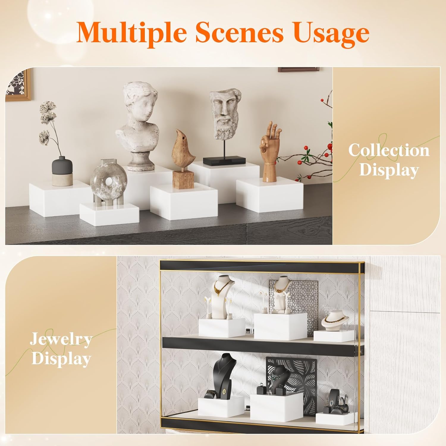 - Versatile Use: Beyond showcasing cakes and other foods, these buffet risers and stands can also display collectible figurines, sculptures, jewelry, and crafts. They can be inverted as storage boxes for cosmetics, office supplies, and more
