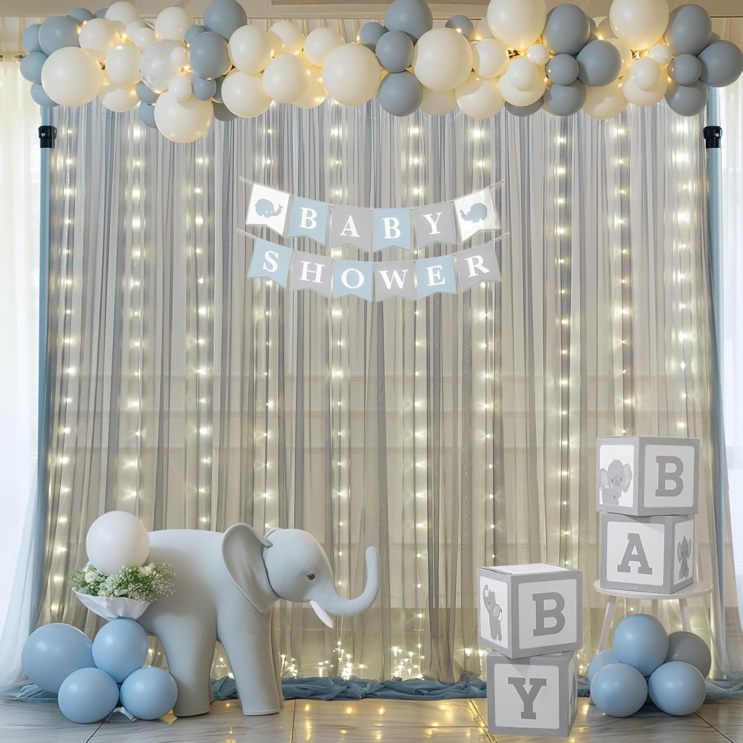 - Products include: 10ft × 10ft wrinkle free silver grey sheer tulle backdrop curtain, a set of 9.8ft warm white string light and 12pcs Transparent clips (no remote control).