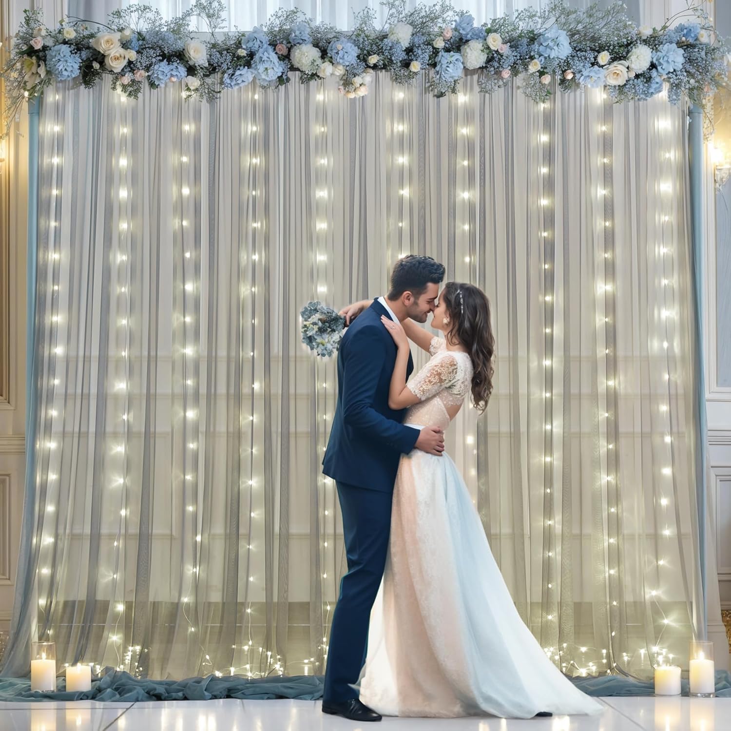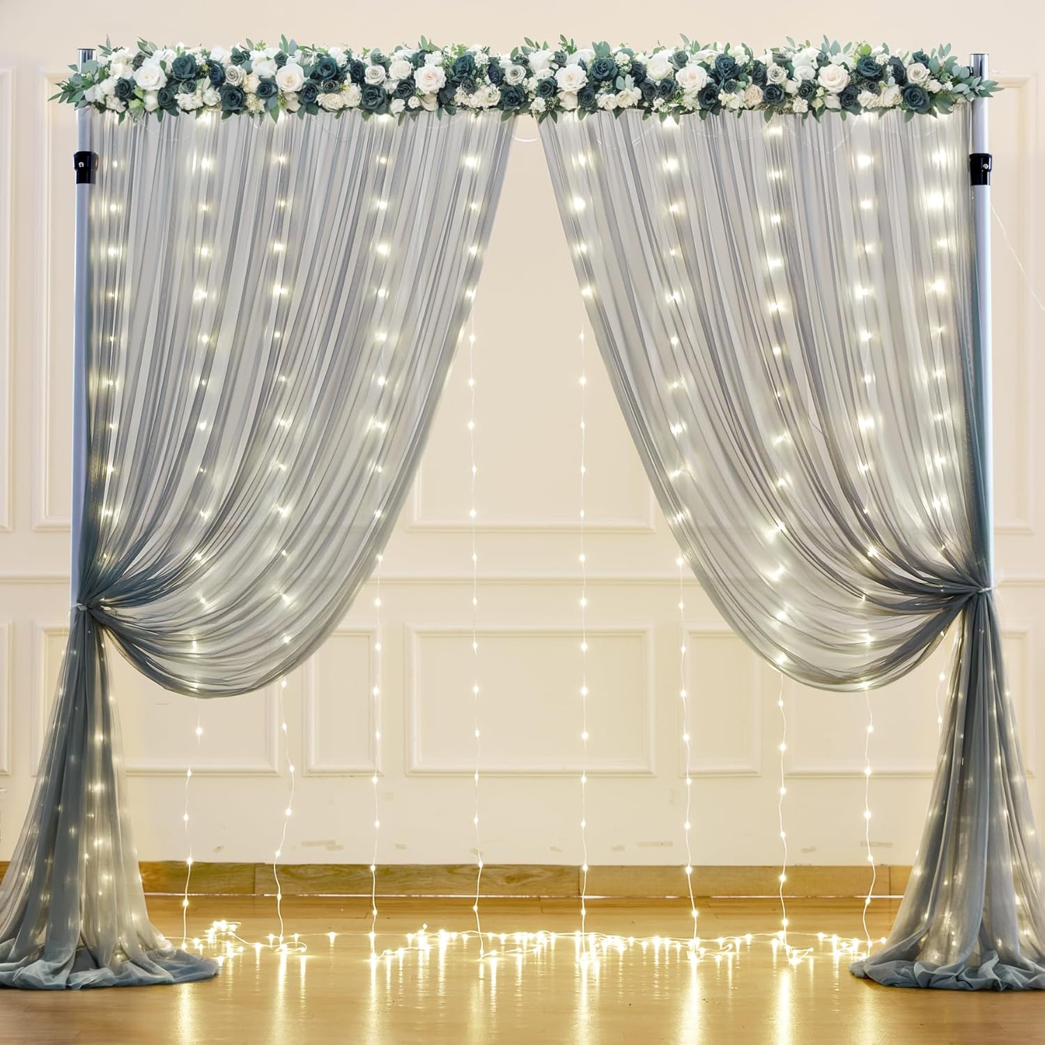 - Silver grey sheer backdrop curtains with lights wide range of use : Perfect for wedding backdrops for reception, wedding ceremony, photo booth, baby shower, birthday party, gender reveal, bridal shower, engagement, photography backdrop, photoshoot, graduation, home room decorations, candy buffets, dessert tables background, Christmas backdrop curtain decorations or anywhere you want.