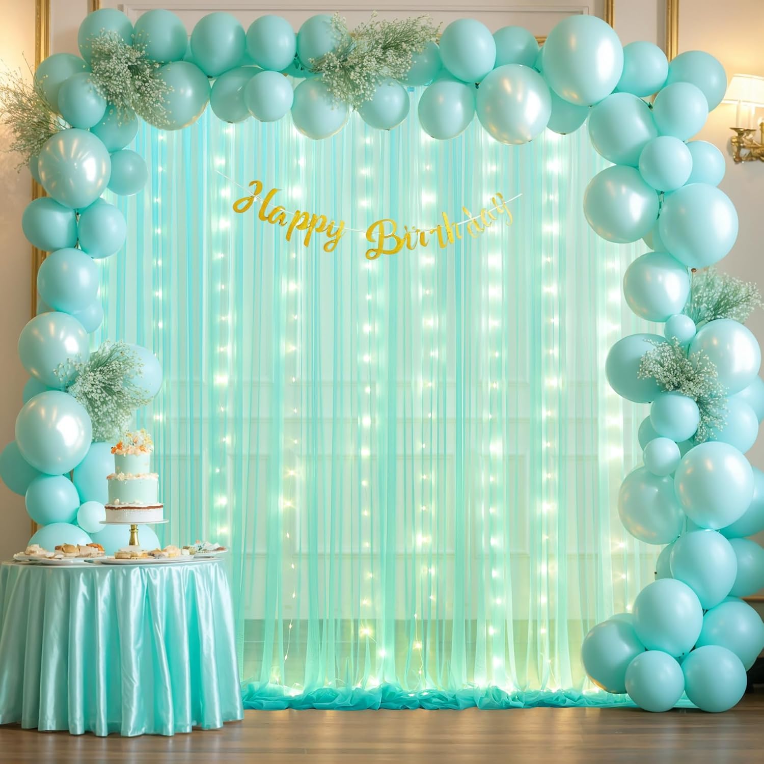 - Products include: 10ft × 10ft wrinkle free light sage green sheer tulle backdrop curtain, a set of 9.8ft warm white string light and 12pcs Transparent clips (no remote control).