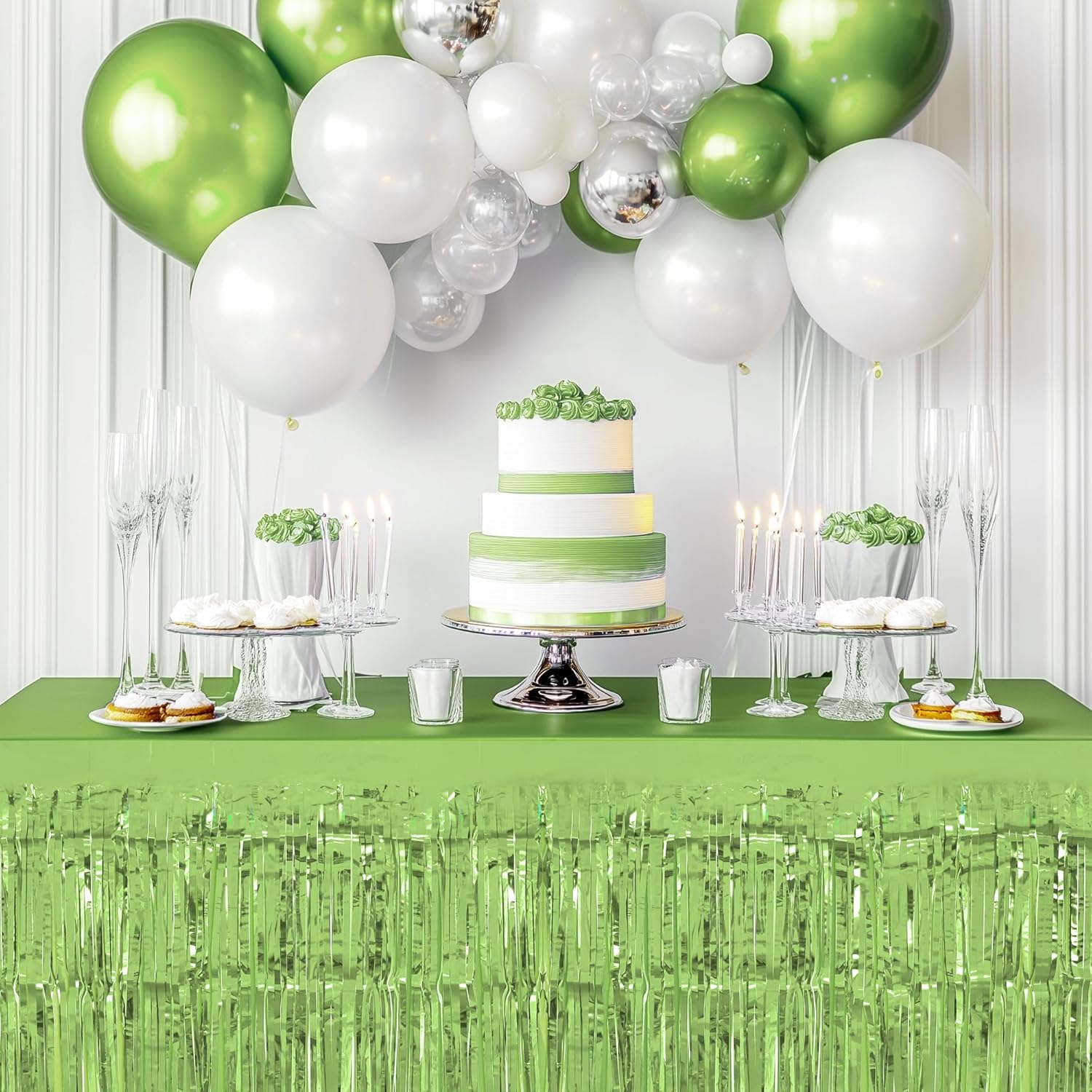 1 Pack Light Green Table Skirts, 29x108" Metallic Foil Tinsel Fringe Table Skirts for Rectangle Tables Streamer Curtains Backdrop, Party Decorations for Birthdays Weddings Holidays