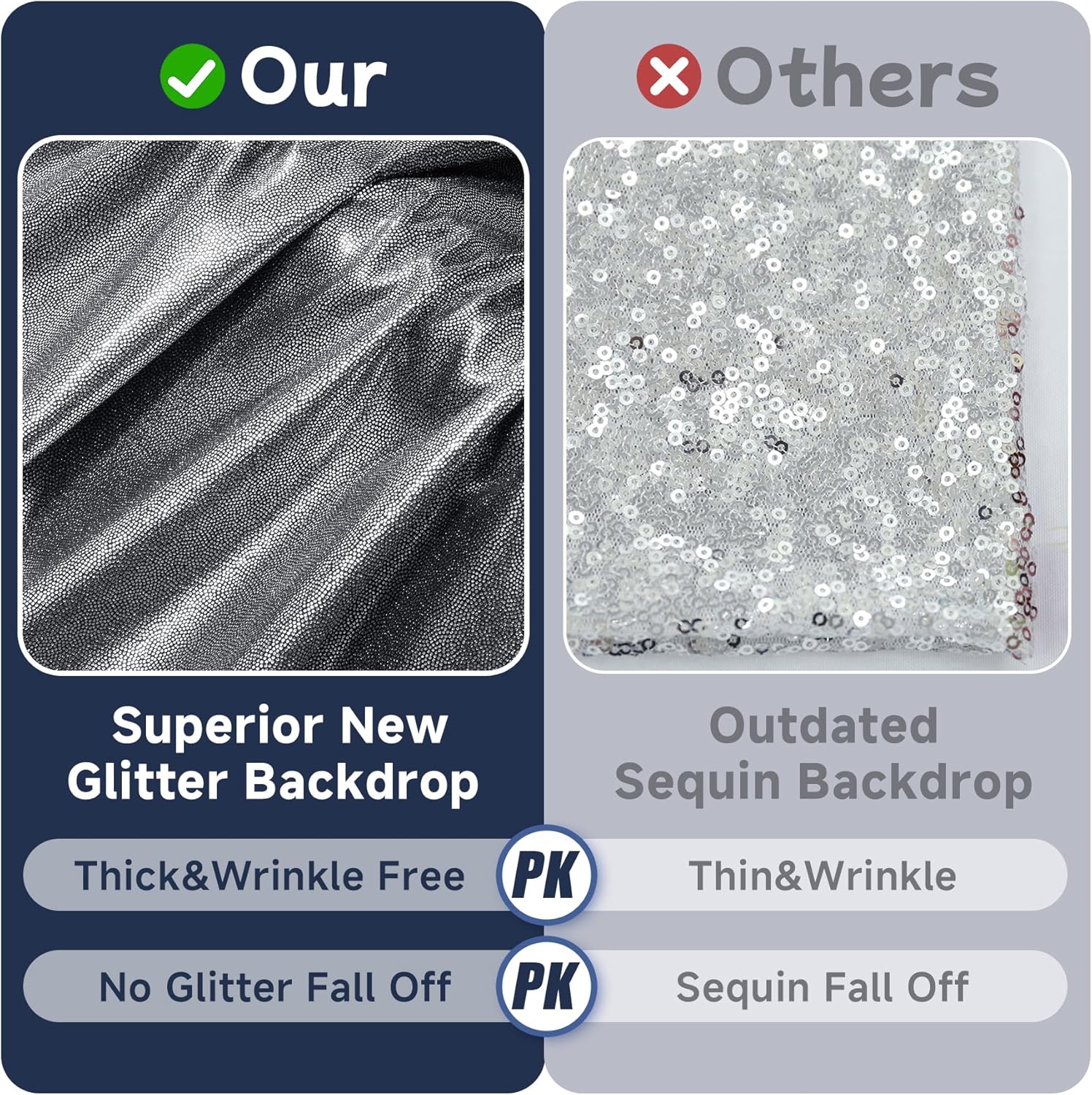 - New Glitter Sequin Backdrop Curtain - Made of soft and smooth polyester fabric and glitter, more superior than ordinary sequin backdrop curtains. It's more thick and not falling off sequins, make your parties more charming and sparkling.